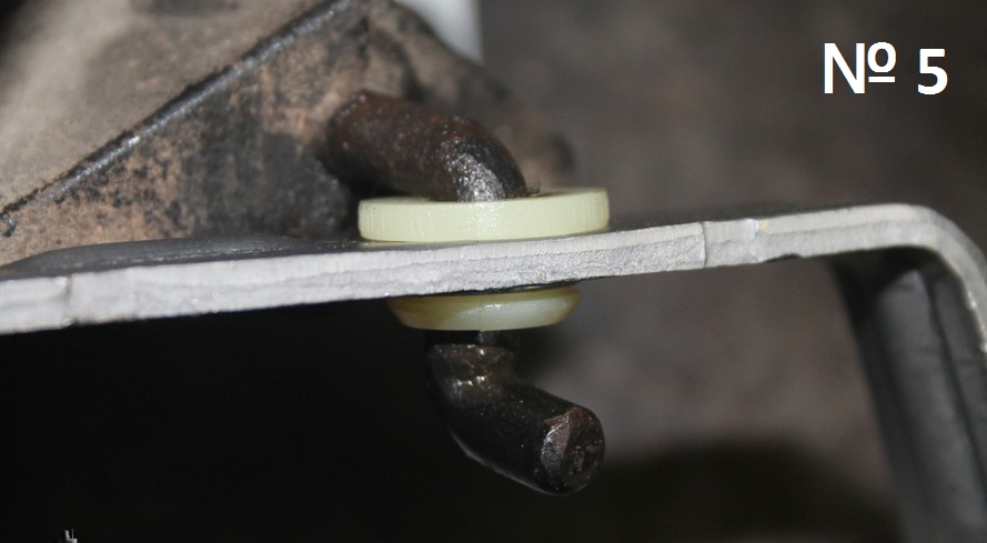 Оранжевата втулка е в края на хоризонталния лост,към двигателя. Лошото е,че за да се смени другата втулка/ в кутията, в купето/ се налага снемането на част от ауспуха и изолацията над него. Разбутването- керноваш положението на предния край на хор. лост и при събирането се внимава да съвпаднат керните.