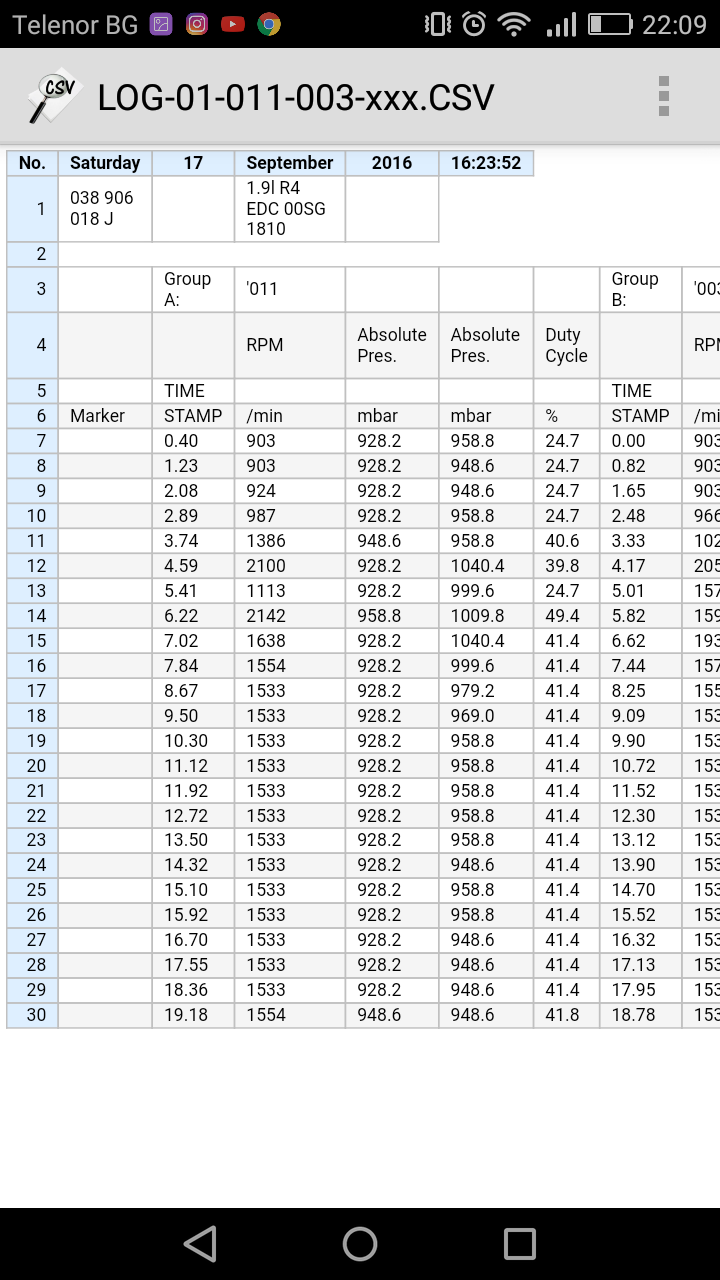 Колеги извинявайте за забавянето ,бях ангажиран с други работи.Направих нови логове надявам се да са както трябва и да кажа ,че след 3000 оборота колата едвам набира.