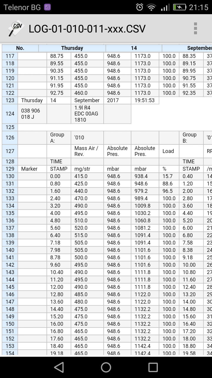 Здравейте колеги.Голфчето забива на 3000 оборота когато двигателя загрее,а когато е студен няма проблеми.Мисля ,че не е от дебитомера защото пробвах с друг работещ и работата си е същата.Направих лог файлове на 3,10 и 11 канал с ваг-ком.Това са ми първите опити за лог файл,така че се извинявам ако не съм ги направил както трябва.Ако има колеги които да помогнат ще съм много благодарен.
