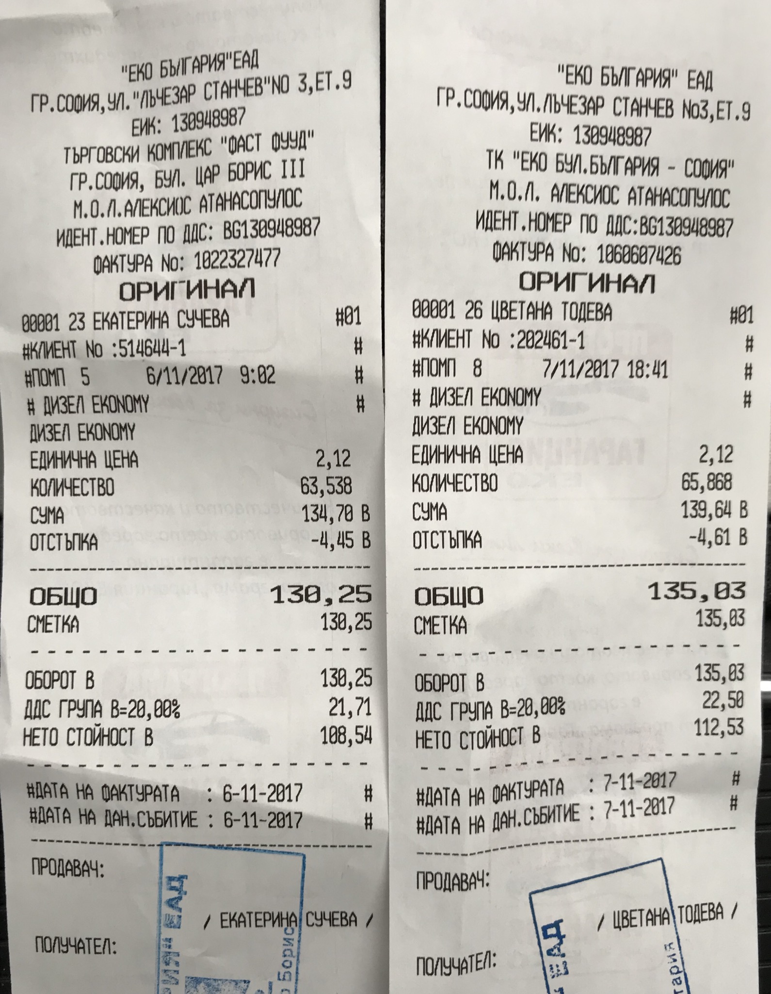Две зареждания на две различни бензиностанции Еко в София вчера и онзи ден в делнични дни. Отстъпка 7 стотинки на литър дизел.