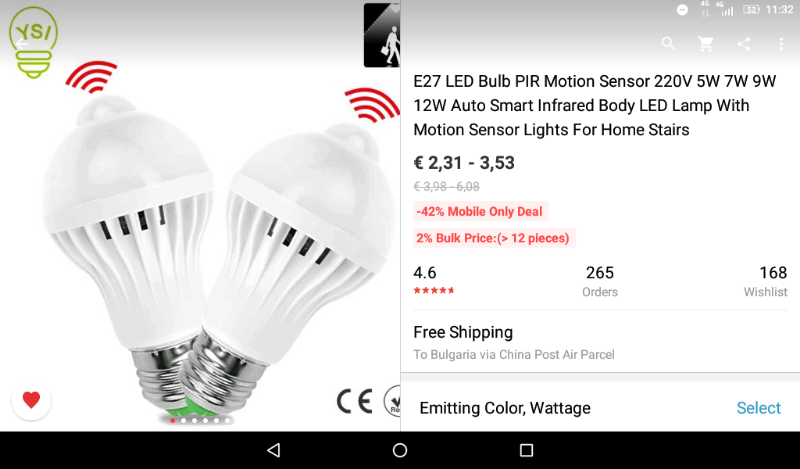 В мобилното са намалени 42%, в десктоп версията са намалени 41% за още два дена после ще видим. Взех вчера една бройка Е27 12W за 3.53€ с датчик за движение да видим колко ще изкара и дали ще върши работа за коридор.