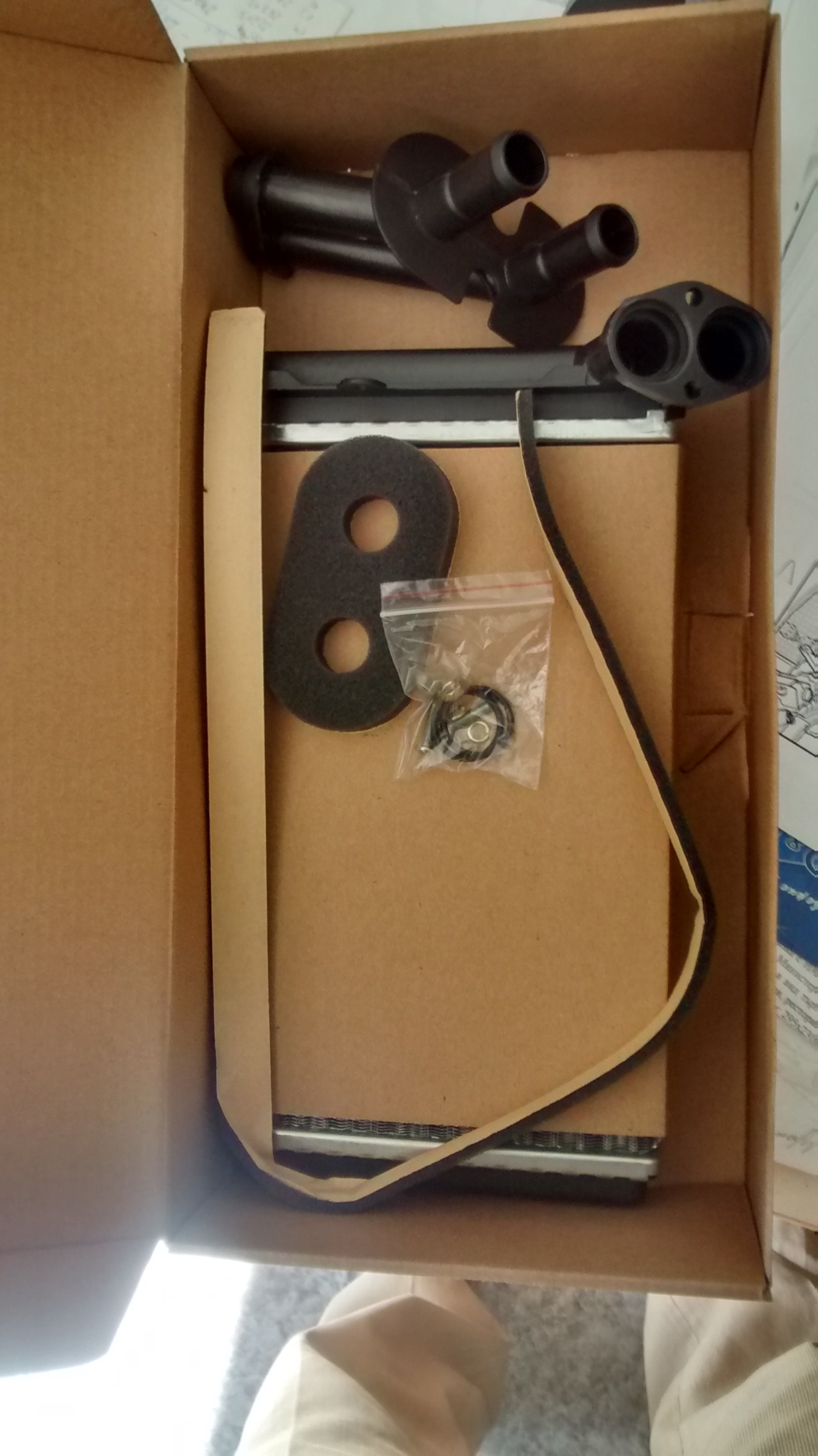 Не съм я свалял кутията - по-горе има снимка на срязаното с дремела и вадене на радиаторчето. Гайките на торкса на фланеца на радиаторчето превъртяха във фланеца, затова се наложи и рязането. Писах по-горе ,че уплътнението не е дунапрен , а дебела микропореста гумя , която много трудно се пробива така на място дори и с остра кръстата отвертка.