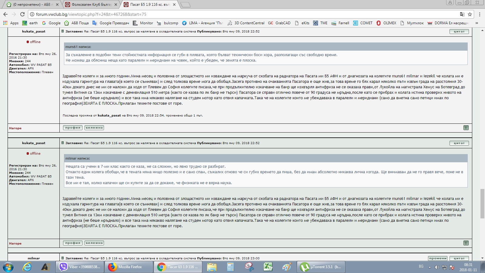 Здравейте колеги и за много години.Мина месец и половина от злощастното ми изваждане на маркуча от скобата на радиатора на Пасата ми Б5 АФН и от диагнозата на колегите muns61 milmar и Iezekil че колата ми е издухала гарнитура на главата(в което се съмнявах) и след толкова време мога да обобщя.Засега противно на очакванията Пасатора е още жив,за това време го бях карал няколко пъти извън града на разстояния 30-40км докато днес не ми се наложи да ходя от Плевен до София колегите писаха,че при продължително изкачване на баир ще изхвърля антифриза не се оказаха прави,от Лукойла на магистрала Хемус на Ботевград до тунел Витиня са 13км изкачване с денивилация 510 метра (както се казва по як баир не търси) Пасатора се справи отлично повече от 90 градуса не мръдна,после като се прибрах и колата истина проверих нивото на антифриза (не беше мръднало) и все така има някакво налягане на студен мотор като отвия капачката.Така че на колегите които ме убеждаваха в паралели и меридиани (само да вметна само петици имах по география)ЗЕМЯТА Е ПЛОСКА.Прилагам техните постове от горе.
