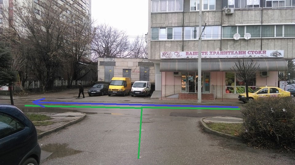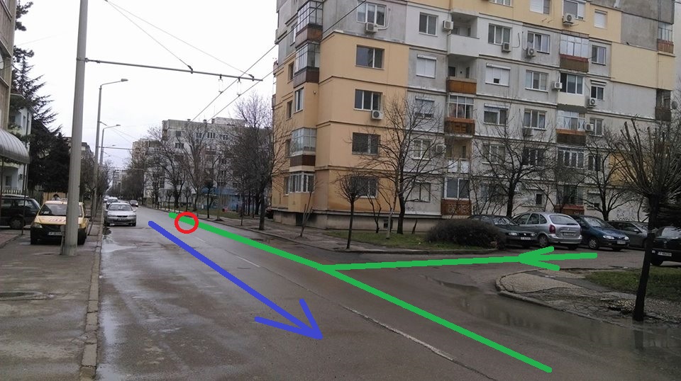 Втората снимка: Улицата със синята линия е еднопосочна, като това от погледа от снимка едно няма как да се разбере. Никакъв знак, никаква маркировка. Нищо. Завилия на дясно по зелената линия се блъска с идващ по синята линия около червения кръг.