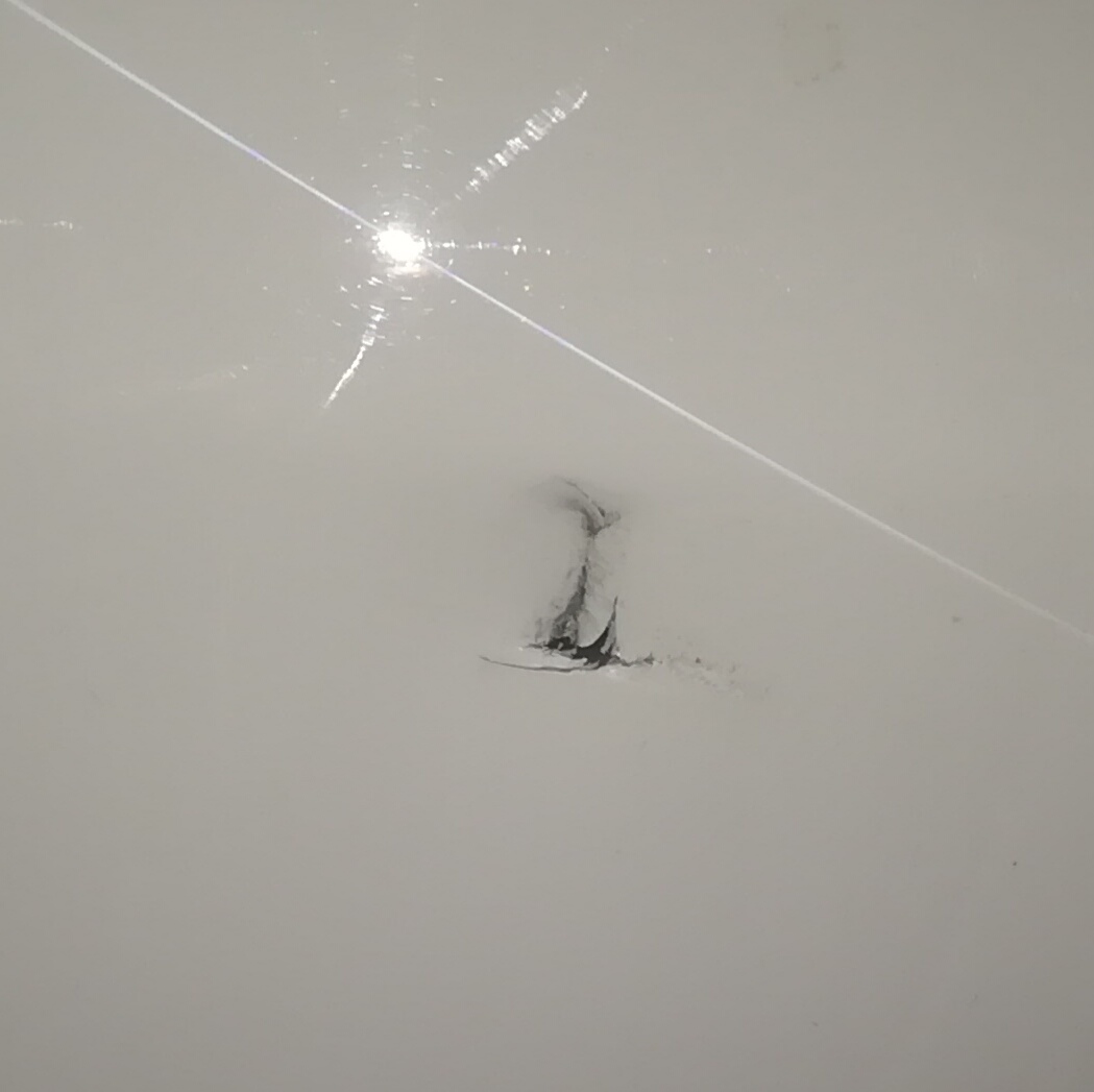 Не е спукана, съвсем леко е вдлъбнато, дали да не мина само с бяла боя с клечка за уши, колкото да не си личи черното