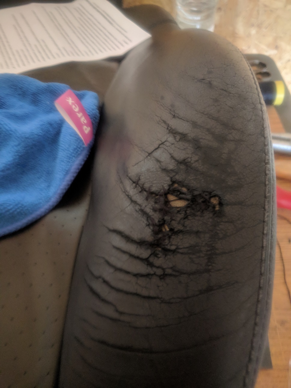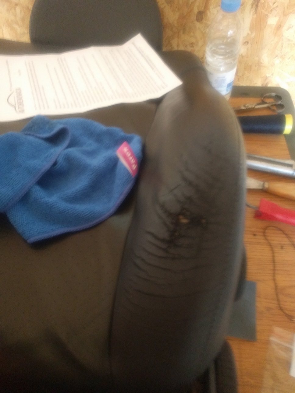 4.Скъсаното първо приших с конец и закривена игла, за да се прибере. Ако има липсващо парче, може да се използва и кожа подобна на вашата седалка без значение от цвета и да се пришие наново. Абе като кръпка. Ако отдолу е скъсан и плата над дунапрена си поръчвате от същата фирма подложка 3лв.