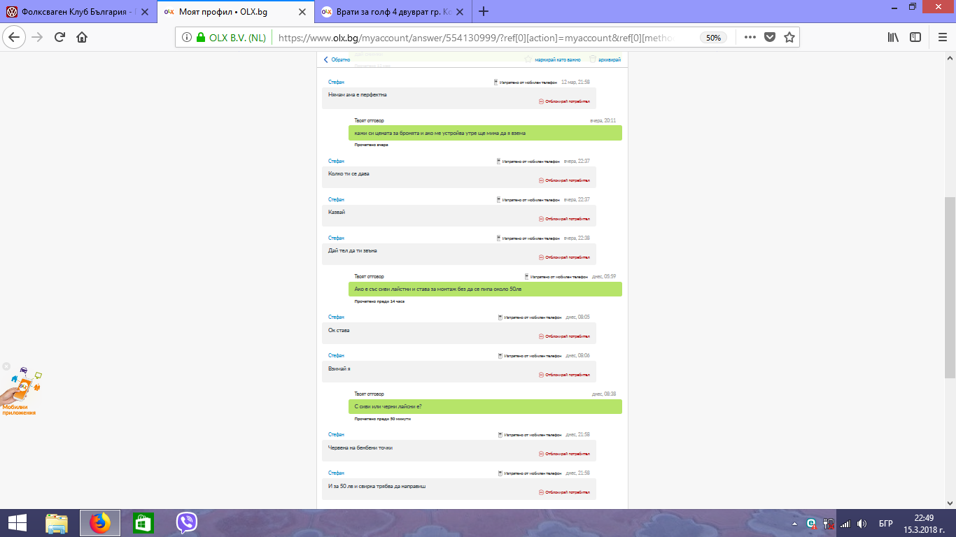 От няколко дни търся задна броня за голф 4 и намерих обява за части от голф 4 обявата е от Костинброд аз от София и реших да пиша на продавача и да го попитам за състояние и цена на бронята.Това е обявата а това е хронологията. https://www.olx.bg/ad/vrati-za-golf-4-d ... 069e5e7cc8 .Как бихте го коментирали?