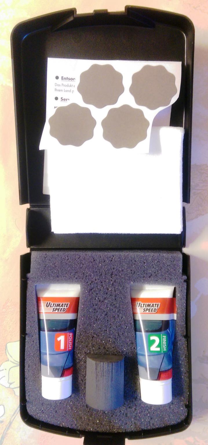 Съдържа 2 вида пасти, по-груба и финна, няколко мокри шкурки, една порьозна гъба и кърпа за полиране. Планирам пролетно основно почистване на пасата ми, ако се покажат драскотини ще ги лекувам с комплекта.
