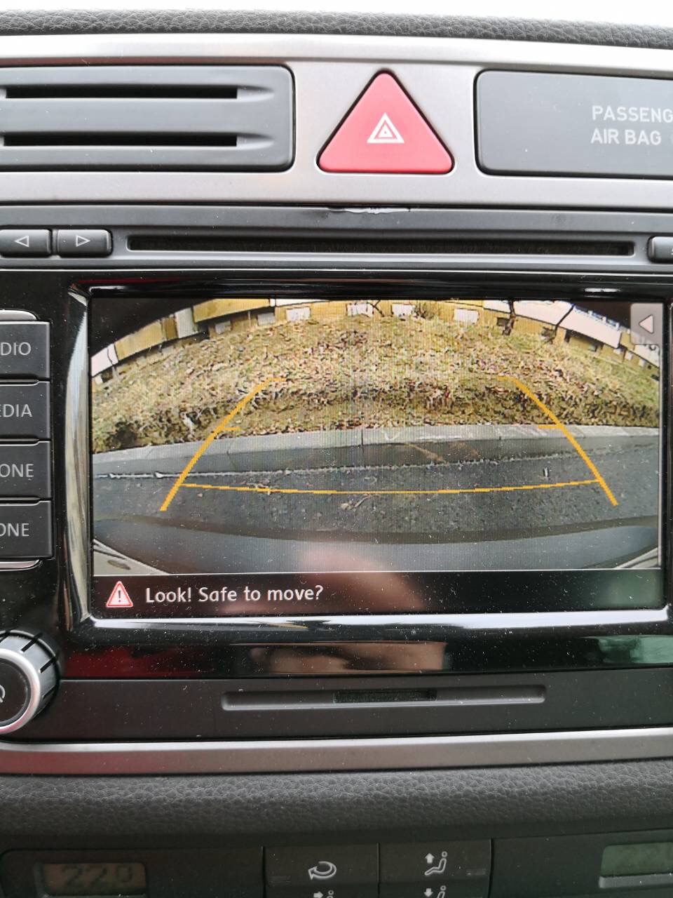 1. Предварително начертайте зад автомобила прави линни от двете страни, както и напречни за ориентация за разстоянието. В моя случай използвах хартиено тиксо, като напречните са на 1 и 2 метра от задната броня. След това включете задна и снимайте екрана на мултимедията.
