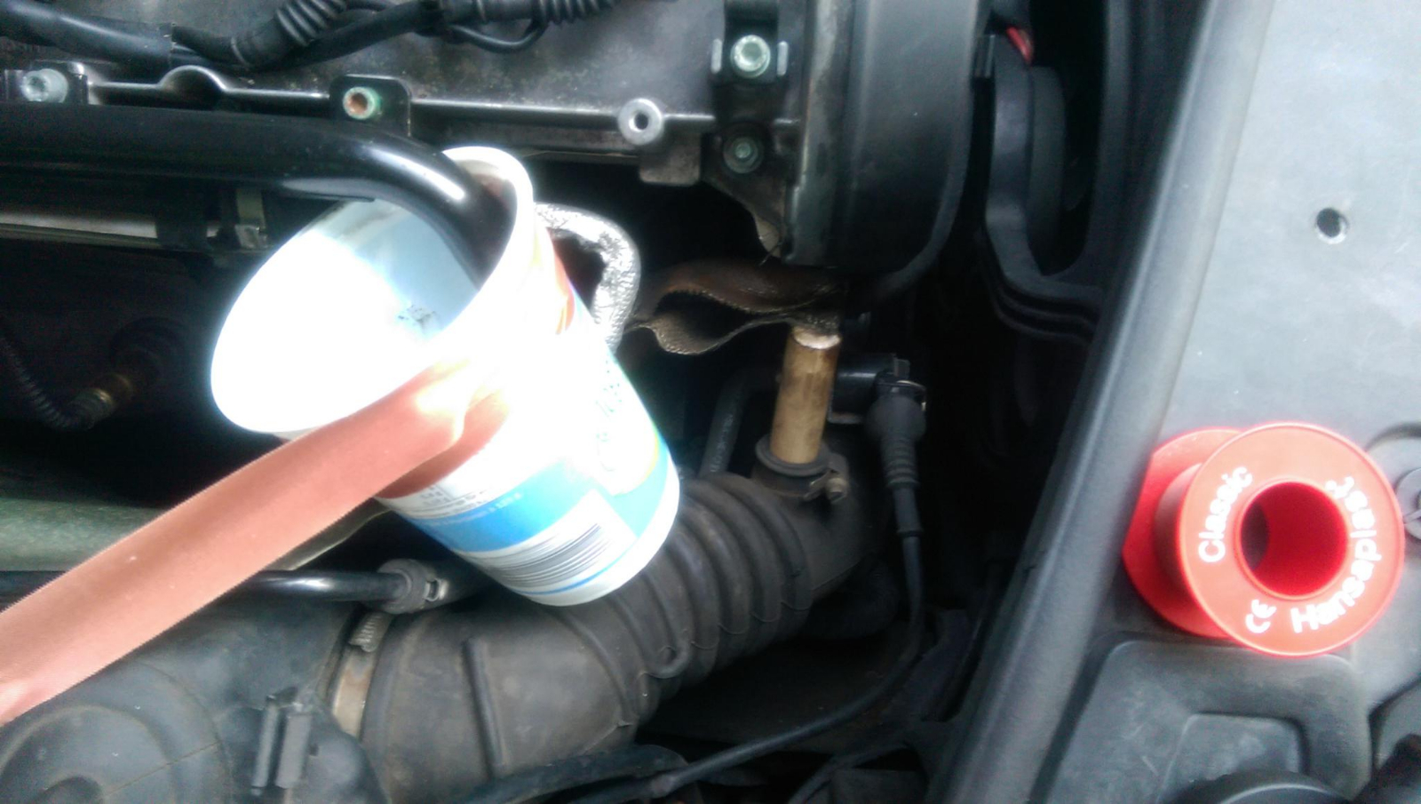 В момента колата е така, затапено е към смукателната тръба, не може да дърпа въздух. Утре мога да сменя кутията от кисело мляко с тенекиена, понеже е близо до мотора, обаче от там за сега нищо не тече.