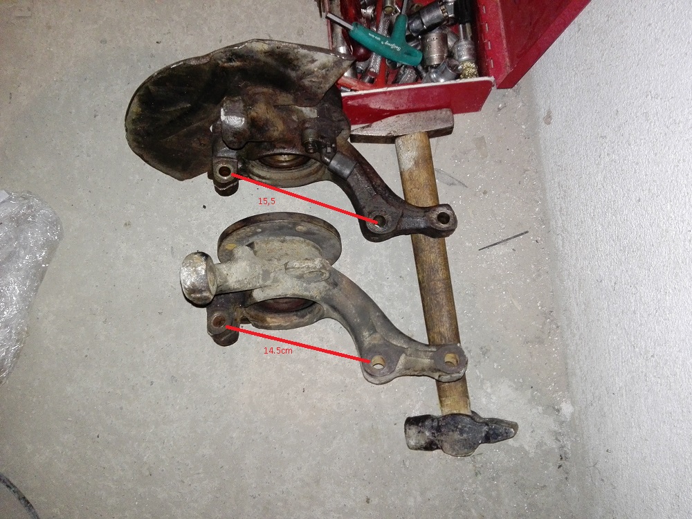 Колеги, открих къде е проблемът. Шенкелите на Толедо и Пасат Б3 имат разлики. При проверка в ЕТКА излизат с еднакъв ОЕМ, но в моя случай, имат разлики. Разстоянието между болта на шарнира и долния болт, с който се крепи към амортисьора имат около сантиметър разлика измерено с ролетка. А именно 15,5 при Толедо и 14,5 при Пасат и при моя стария шенкел. Ако поне носачите толедо-джета са 1:1, както е според ЕТКА, това значи, че просто при толедо има по-широка следа отпред( конкретно моделите, които са с 256 вентилиран AFT и AGG). Ще приложа и снимки по-късно, че сега съм омазан. Пратих баща ми с двата шенкела от Пасат да им махне скъсаните болтове, че ги получих бонус с по един скъсан болт за предпазната ламарина и единия със скъсан болт за фиксаж на диска към главината. Бях доволен преди време от колегата Оги, но едва ли ще пазаря трети път от него.