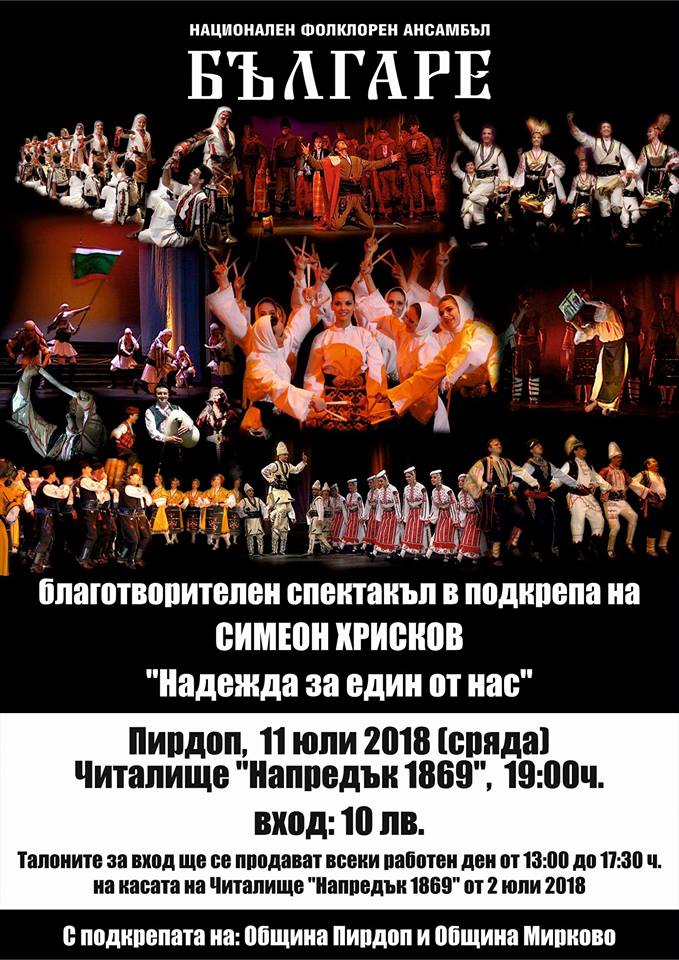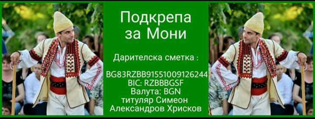 Накратко - Симеон Хрисков - Мони е на 35 години, един от най-ярките образи и солист в най-новата история на Шопски ансамбъл, гр. Елин Пелин и баща на 10 месечен син. Диагностициран и лекуван в България с рядък и агресивен тумор - синовиален сарком на ляво ходило. Поради спецификата на заболяването, му беше извършена подбедрена ампутация, с цел предотвратяване на разсейки. Диагнозата му налага последващо лечение, каквото в България не може да бъде извършено. Най-добрата получена оферта от чужбина е от American Hospital в Истанбул. Трябва да се направят 6 курса химиотерапия, като 3 вече са направени. Остават още 3, както и последващи изследвания и ако се наложи след това, още процедури. След последната направена процедура, лекарите са оптимистично настроени и дават много големи надежди за оздравяване.