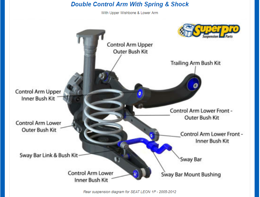 Ето точно този тампон / в червено Control arm lower inner bush kit/ се сменя и от там се регулира и схождението. Трябва да се изреже и болта и да се замени с нов, защото е яко запекъл, то и за това на реглаже се мъчат хората и се отказват, за да не го скъсат и да остане там колата. Моите тампони не хлопат, но изнасят задните гуми лека-полека и даже мисля, че изнасят и предните. (Преден реглаж минах вече наскоро. Първият път беше като взех колата преди 2г.)