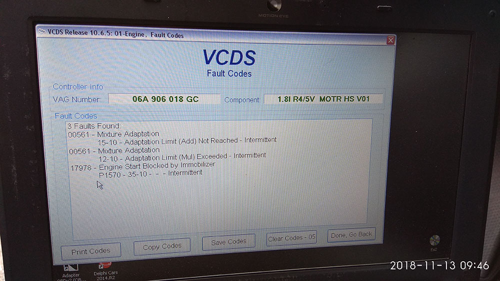 По горе си извадил снимка от диагностиката с ваг ком има една грешка записана че стартирането на двигателя ти е блокирано от имобилайзера.Тук може да е и причината за гасненето на двигателя.