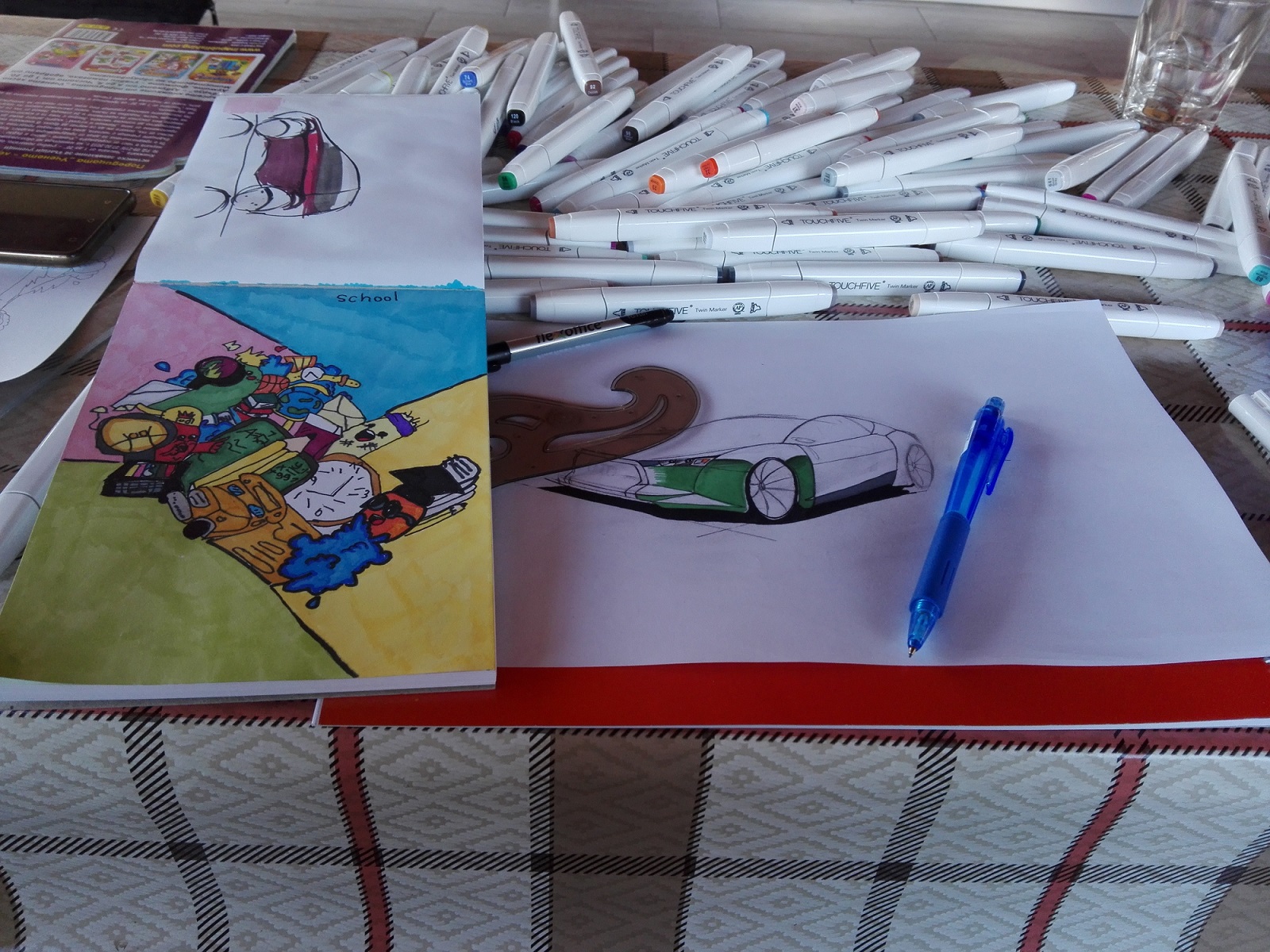 Според мен дъщеря ми има заложби по изобразително изкуство. Понеже за Коледа съм й подготвил подарък - сет от 80 цвята Touch Five маркери за художници (китайският вариант на Copic, с които рисуват доста професионалисти в жанра) й обещах освен маркерите да й изработя органайзър, или не знам как се нарича, за подредба на всичките налични художнически пособия. По-скоро не зная от какъв материал да го изработя - искам хем да е лек, хем да е достъпен като цена и изработка - ще ми се сам да си го проектирам, само да дам някъде да ми го изрежат - аз да си го сглобя. От ПДЧ може би ще понатежава, има един материал, с който изработват рекламите - има сандвич-структура, забравих му името, май му викаха Коматекс.