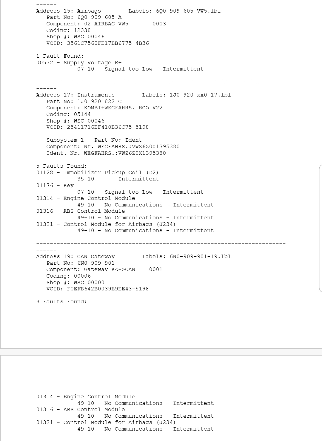 Здравейте, моля за съдействие и насоки за следните грешки... Колата е Golf 4 AJM 115 ps. В момента не може да запали и свети лампата на имобилайзера.В същото време премигва и лампата на подгревните свещи, АBS , ASR и АIR Bag и някакво жужене на реле под волана за кратко. Пробвано и с резервен ключ, същата работа.Последно преди месец е сменян клемореда на колата, понеже една сутрин без никакви предишни симптоми, стартера въобще не искаше да завърти.