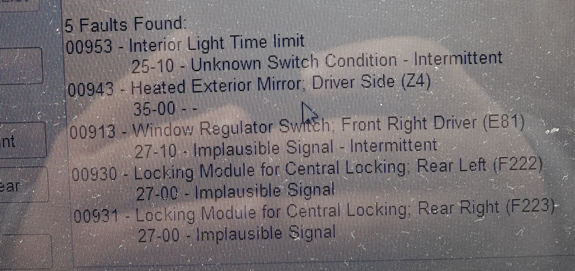 Не ти работи коректно и бутона за вдигане и сваляне на дясното предно стъкло, този бутон който е от страната на шофьора. И освен това имаш проблеми със заключващите механизми на двете задни врати.