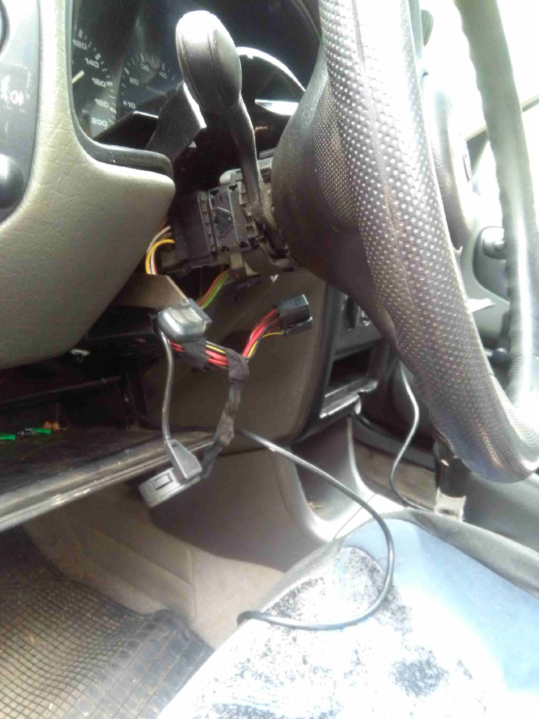 Реших, че съм се разминал само с радио, но после като се загледах видях, че около волана корите са счупени, гривната на фабричния имубилайзер около контактния ключ висеше свободно и куплунгът с кабели към контактния ключ е изваден. След като се загледах още по-подробно установих, че металната гривна около оста на волана (не знам как и е името), към която са закачени ключовете за мигачите и чистачките и вероятно щифта, който блокира волана е счупена на няколко парчета.