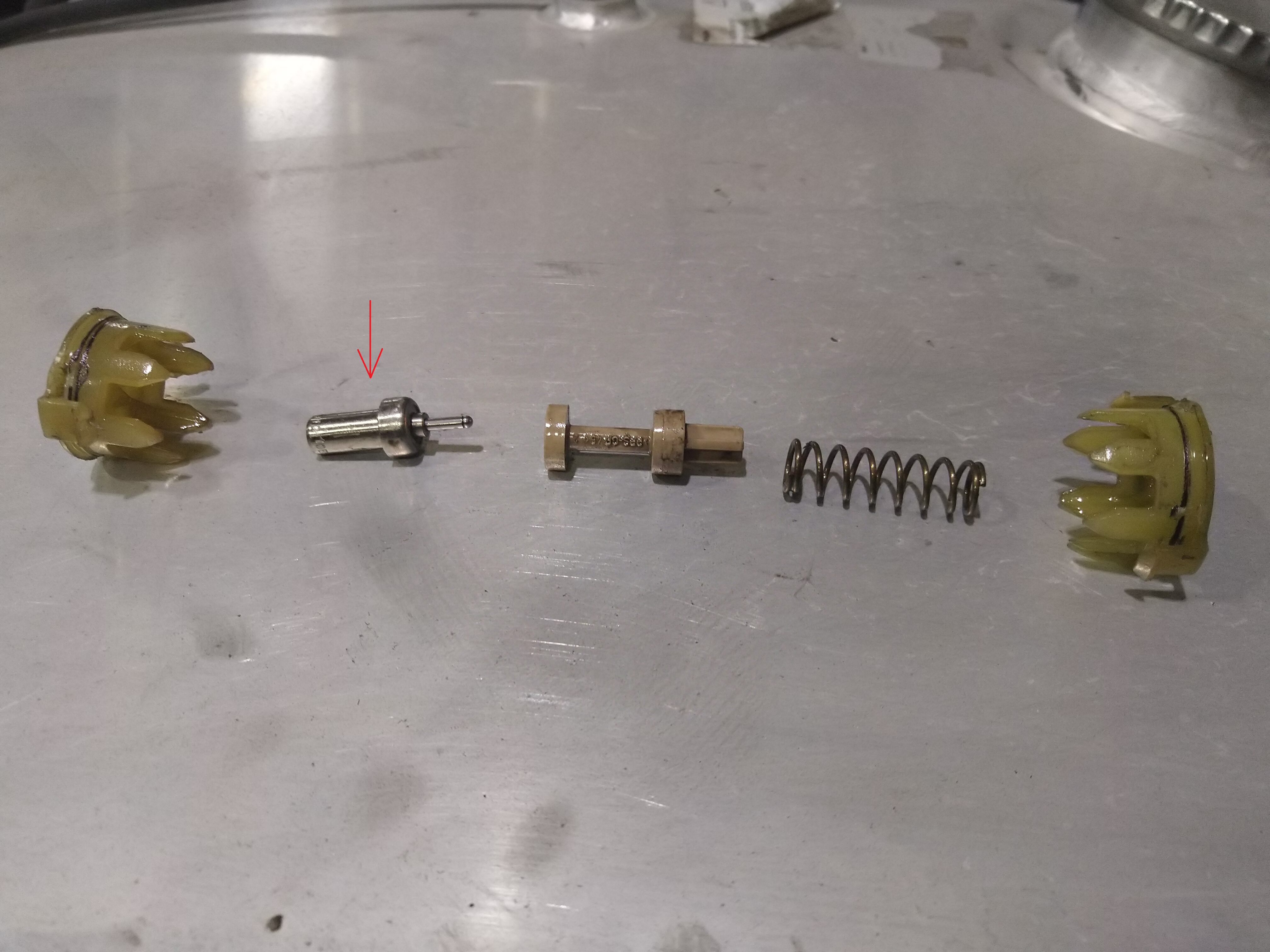 Разглобих старата капачка с учебна цел. На снимката с червената стрелка е термостата. При стайна температура стерженчето е излязло докрай :arrow клапана на горивото връща към резервоара. Никъде по механизма няма гумички или О-пръстени. За съжаление на термостатчето никъде не пише температура на отваряне.