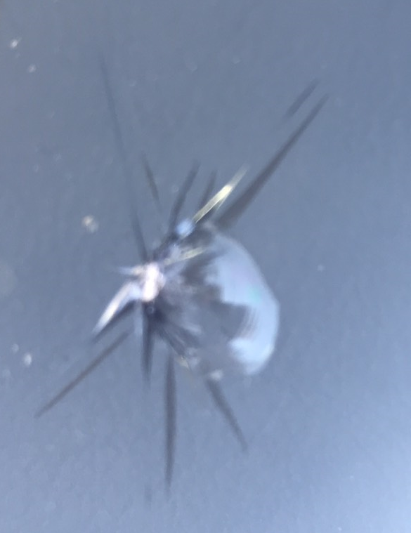 Днес с изненада видях, че имам дупка на предният прозорец. Някой май го е стрелял с въздушна пушка. Не е успял да го пробие, но има щета която е с площ горе-долу колкото левче. Малка дупчица по средата (около 2мм) и няколко лъча и люспи. А прозореца е един вид нов - читав, на 2 месеца.