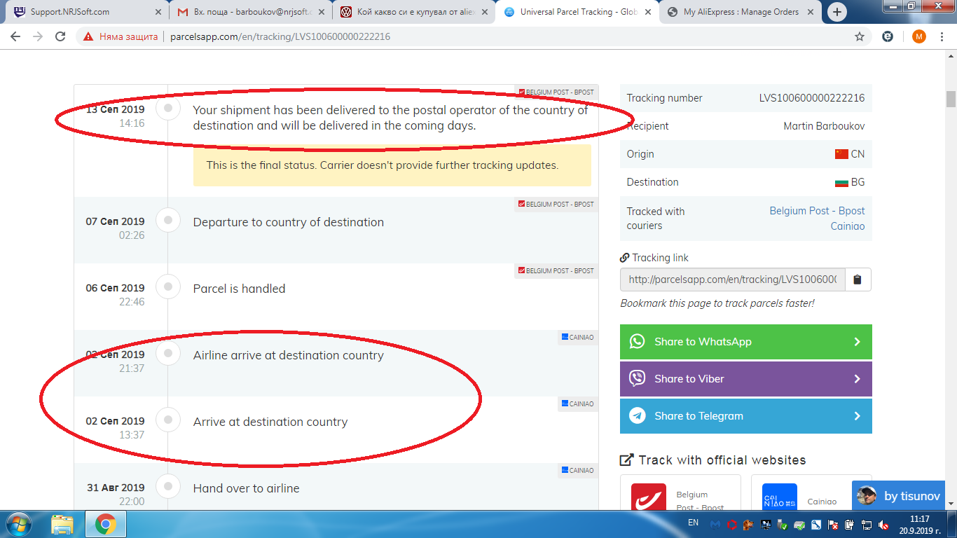 ПП: На 06.09 е пристигнала в Лиеж. Около 10-20 октомври я чакай. Аз имам пратка от 20.08 в Лиеж и още не е дошла, а парите ги върнаха.