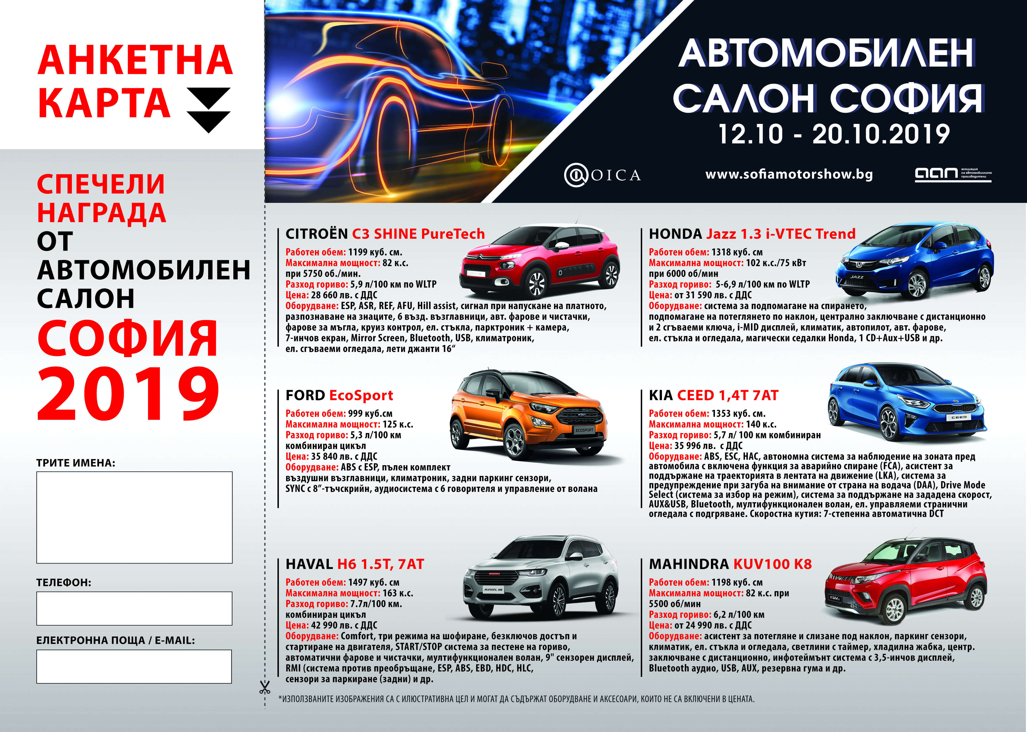 Освен удоволствието да видят, да тестват и да закупят някои от последните модели автомобили, един от посетителите на изложението ще има невероятния шанс да си тръгне с нов автомобил. Изборът е между 12 автомобила с цена от 28 000 до 63 000 лева.