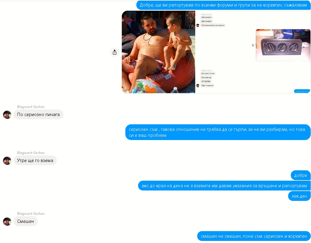 Последният път ми отговори като му пратих снимка с разговора и че ще го рапортувам за не kоректен, че отново уж ще ги вземе и ме нарече смешен и по-сериозно.