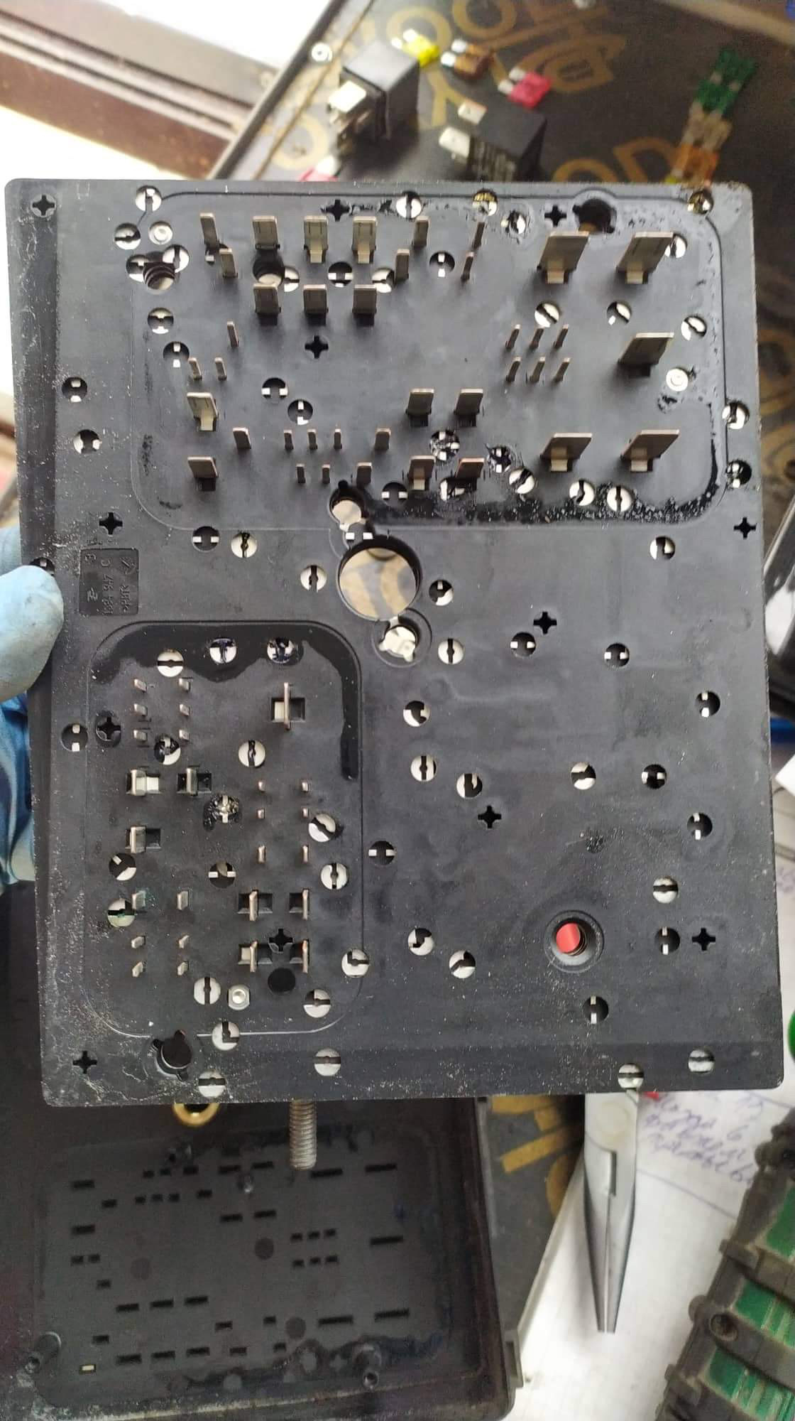 Погледни снимките по-горе. Видимо в тази бушонера е имало обилно количество вода от дълго време. Когато аз мерих бушоните и телетата, всичко си беше ОК и затова не бях тръгнал да разглобявам. Сега обаче се наложи разглобяване по идея на моя колега и излезе прав. Така че, на пръв вид изряден модул се оказа тотално прецакан. Отделно снимките са само на първата плоча с 9-те скъсани писти. Плочите в тази бушонера са 3 ако не се лъжа, предполагам, че и на долните е същата работа. Затова - смяна и всичко вече е ОК.