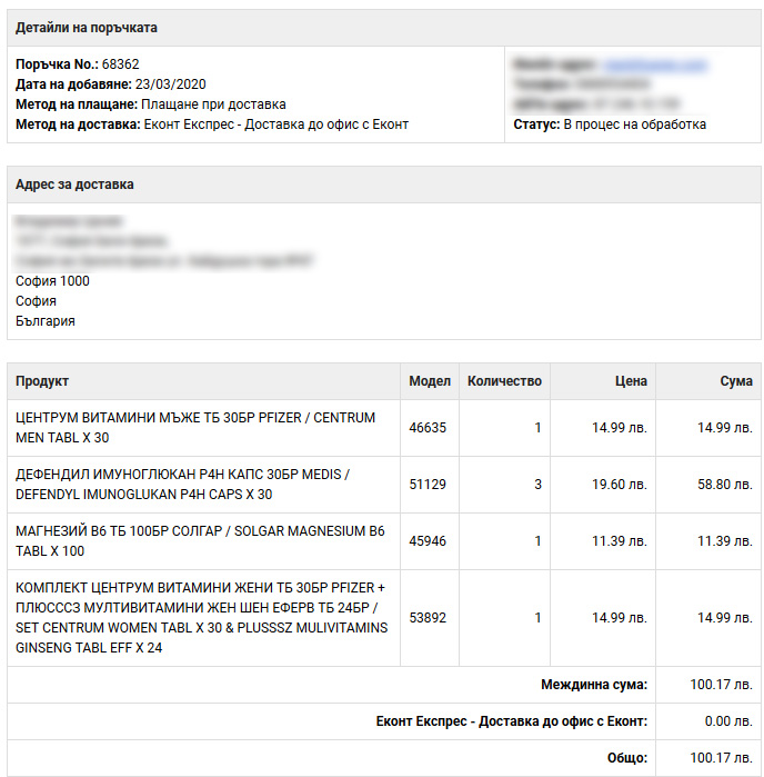 Поръчах продукти на 15.03 след 8 дни попитах какво става с поръчката ми на емайл и отговора беше изчерпана наличност. помолих да ми анулират поръчката потвърдиха ми и след два ми изпратиха продуктите. Аз междувременно ги купих от друго място. НЕ Препоръчвам никаква комуникация.