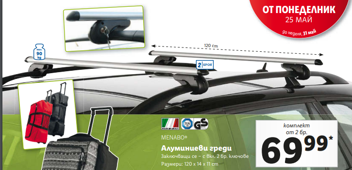 С риск да повторя предишно мнение - В Лидл тази седмица са пуснали алуминиеви греди за покрив. Лично аз не съм ги ползвал и за момента не мисля да си купувам, но имам препоръка от двама човека, че са хубави и издържливи. Само имало няккаъв лек шум при по-висока скорост и ако дразни, могло да се направи някаква малка интервенция.