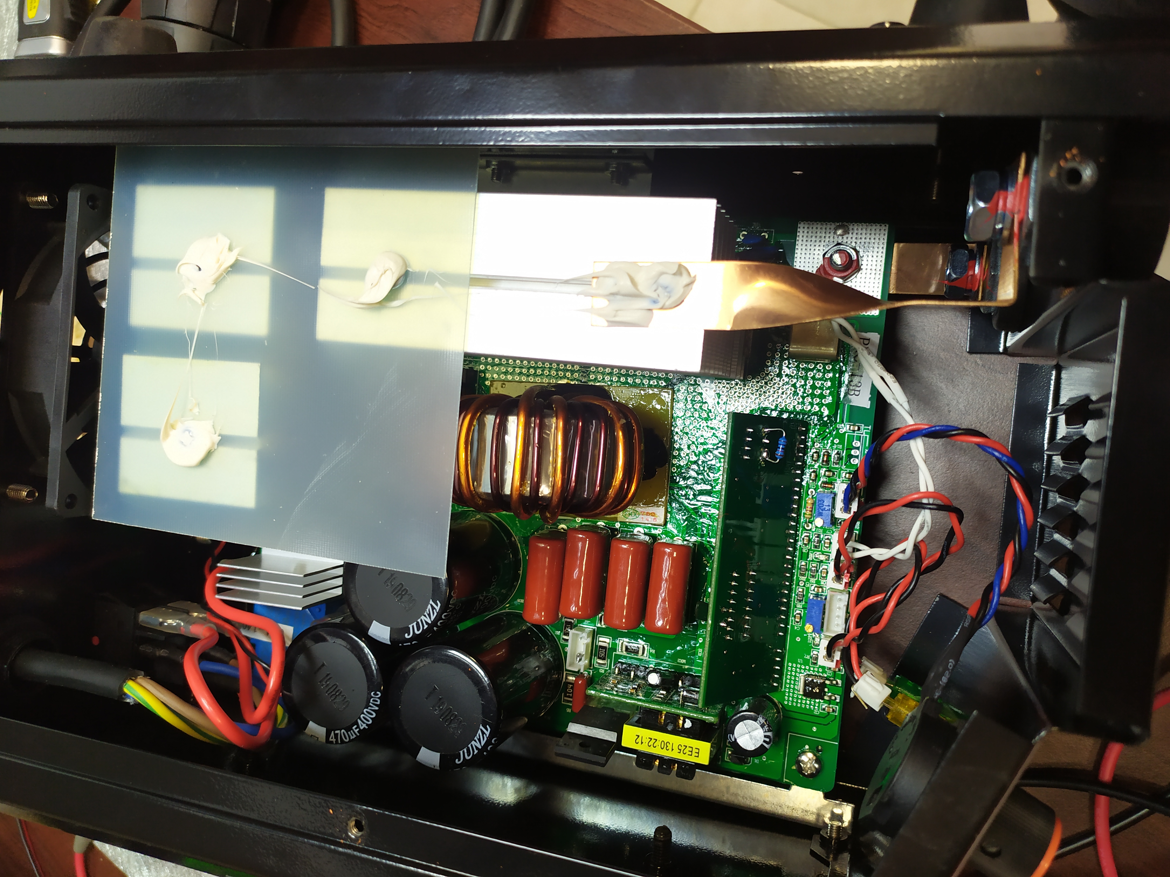 Второто ми впечатление е отвътре - няма как, първо се разглобява, щом е електроника. Платката съвсем очаквано е made in PRC. Добре лакирана, има радиатори, добре ориентирани спрямо вентилатора, но не ме впечатли особенно, очаквах повече. Дано да работи добре, това е важното. Няма колан за носене през рамо, но е лекичък и може да му се приспособи парче сезал например :smile . Вярвам, че ще работи, пък и аз няма да го ползвам в промишлени условия, а и имам електрожен за грубиянски заварки.