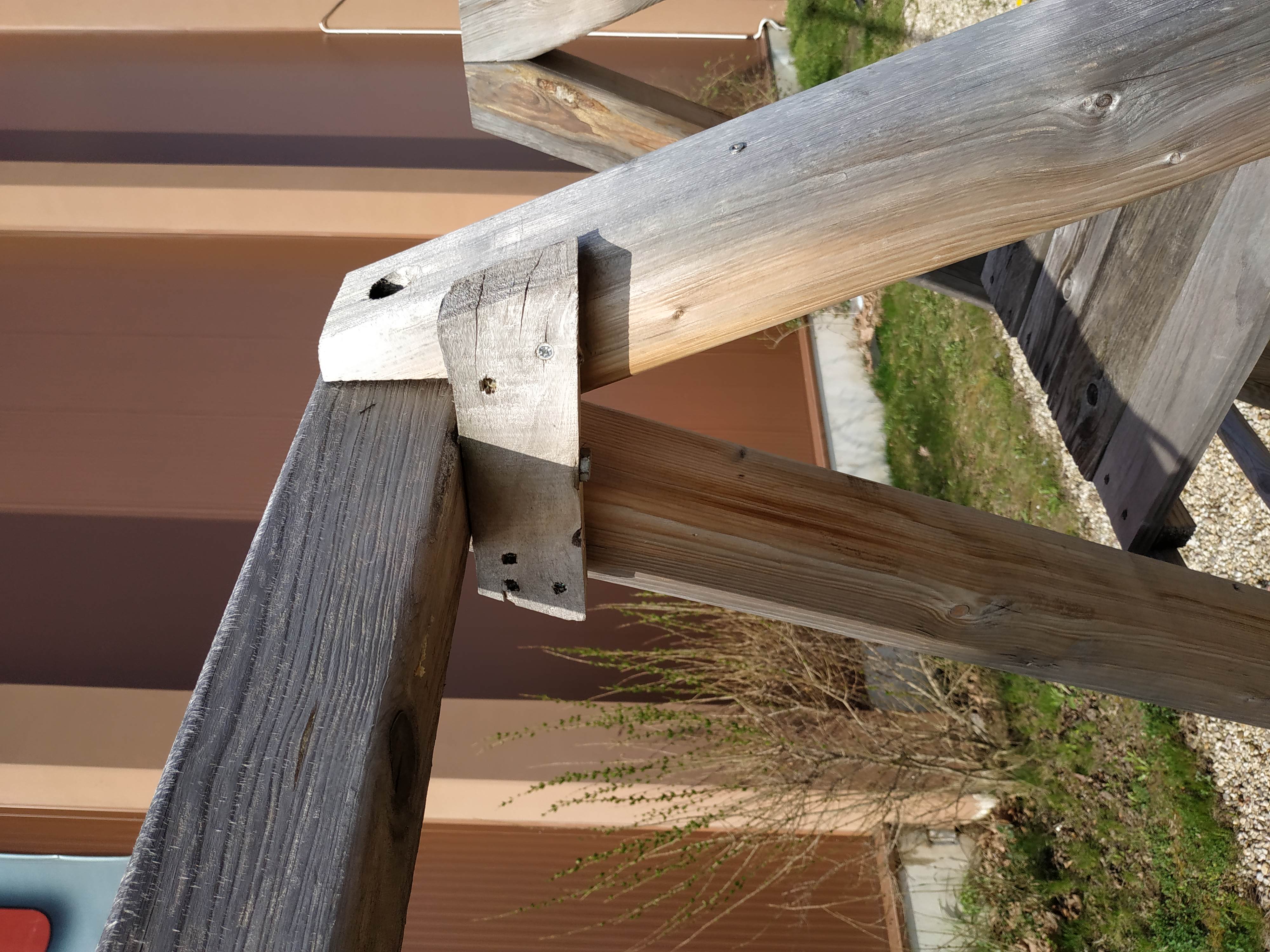 ами, важното е да се получи що-годе устойчива рамка, но и самите странични дъски също заздравяват конструкцията. основата при мен е от цял палет, постлан с парче винил и отгоре ламинат. под покривните дъски също има винил, за хидроизолация. там, където е невъзможно да се завинти дърво в дърво, съм използвал метални планки.