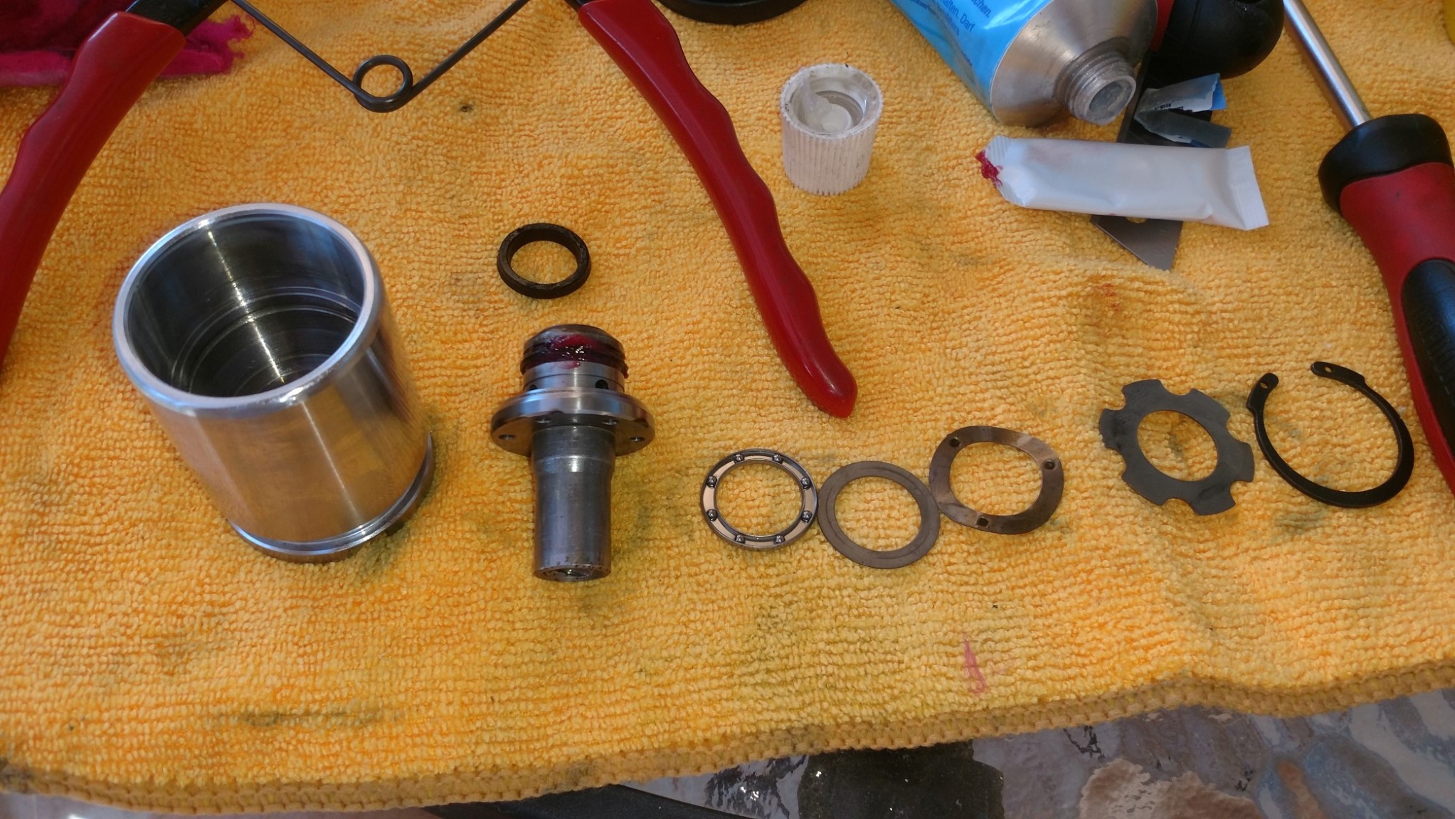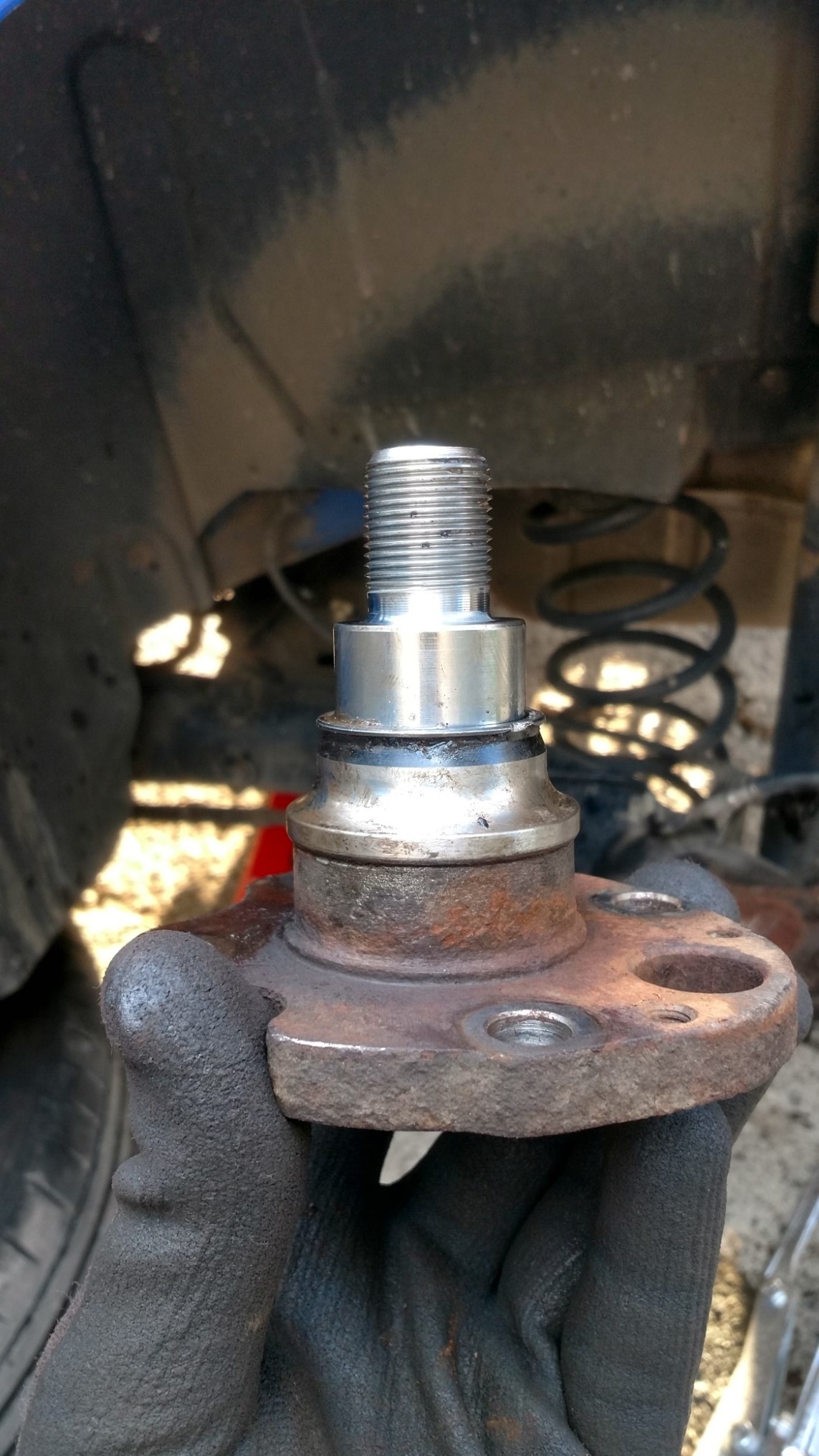 Всичко вървеше добре докато не свалих старите спурачки и не завъртях главините, лагерите ромоляха доволно и се взе решение да се сменят. Поръчах две нови лагер главини, но за късмет при ваденето на старите лагерите се разцепиха и вътрешните черупки останаха на осите. Реших да сваля шенкелите и да ги качвам на ментгемето да видим дали ше разберат от бой със секач, греене и други такива грубости, но се сйъса единия болт на датчика на ABS-а и реших, че да ги оправя тия шенкели ще време и труд ще струва повече от цената на нови.