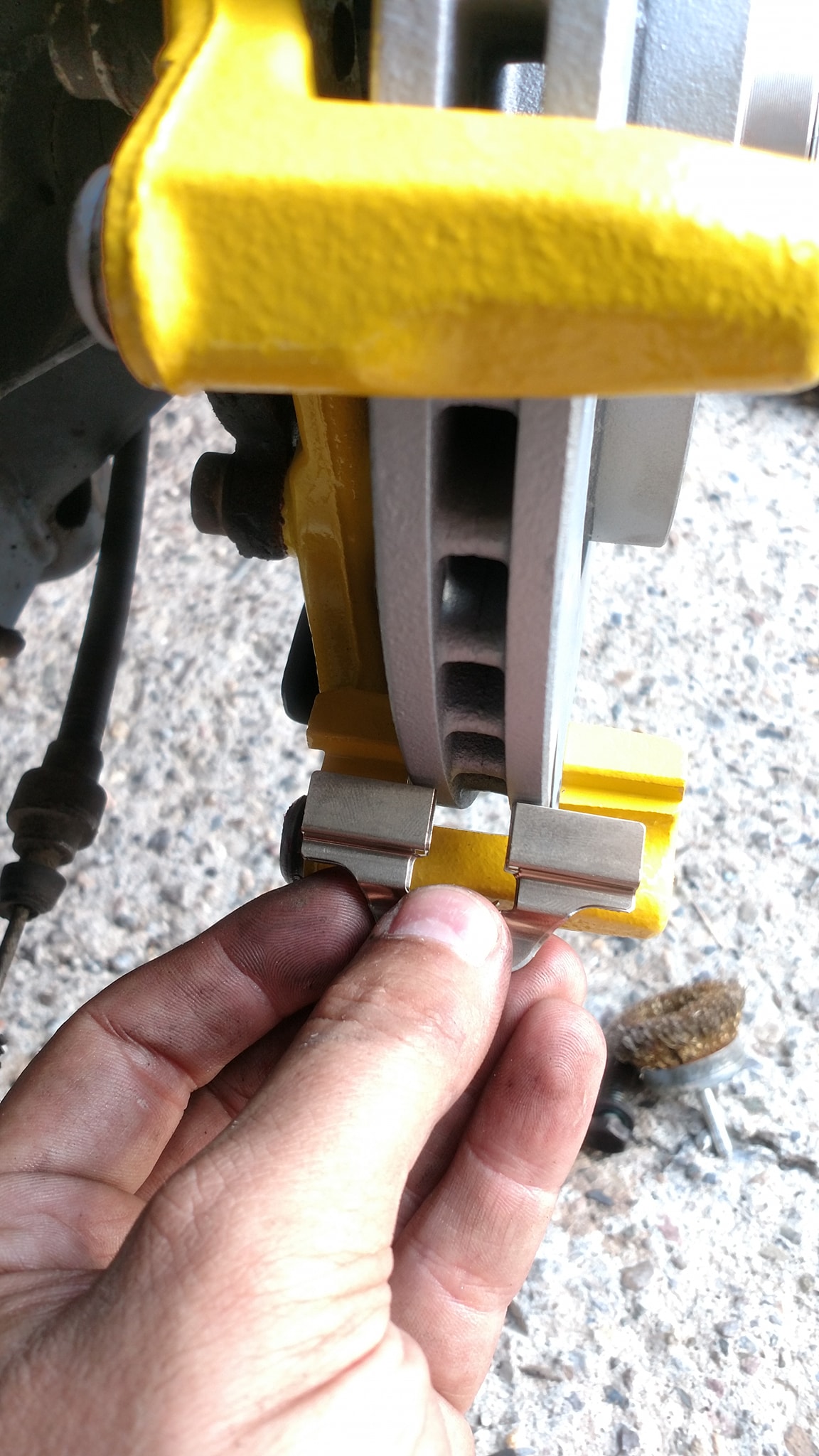 Сложих си старите болтове на супортите като от 8 избрах 4-те най-читави и таман да сложа накладките и греда... Пластинките в комплекта са за плътен диск