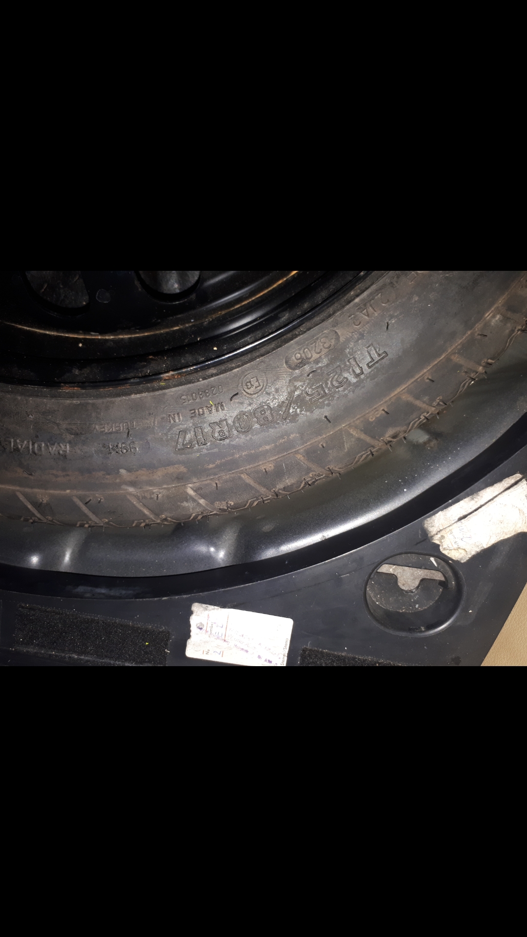 125/70/16 сложих аз патерица чисто нова. По калкулатора за гуми дава разлика от 5 см с оригиналния размер. Но всички знаем, че е за зор- заман да те изкара до първия сервиз. А и няма да караш с 140. Побра се перфектно в отделението за резервна гума. Дори над нея има една кора с някакви отделения за багаж. И отгоре вече е същинската кора, която служи за дъно на багажника