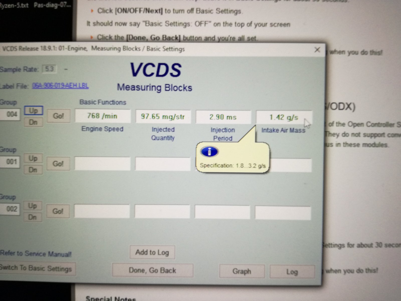 Продължих диагностика VCDS и четене на данни в реално време и това ми направи впечатление за разминаване на данните - прикачени снимки тук, в покой и натоварване при 3000 об. мин.