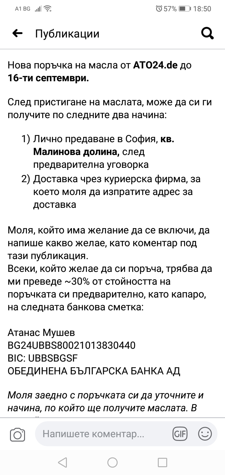 Фейс групата за общи поръчки на масло от АТО24, е все още активна. Вече ново момче е поело организацията по поръчки и доставки.