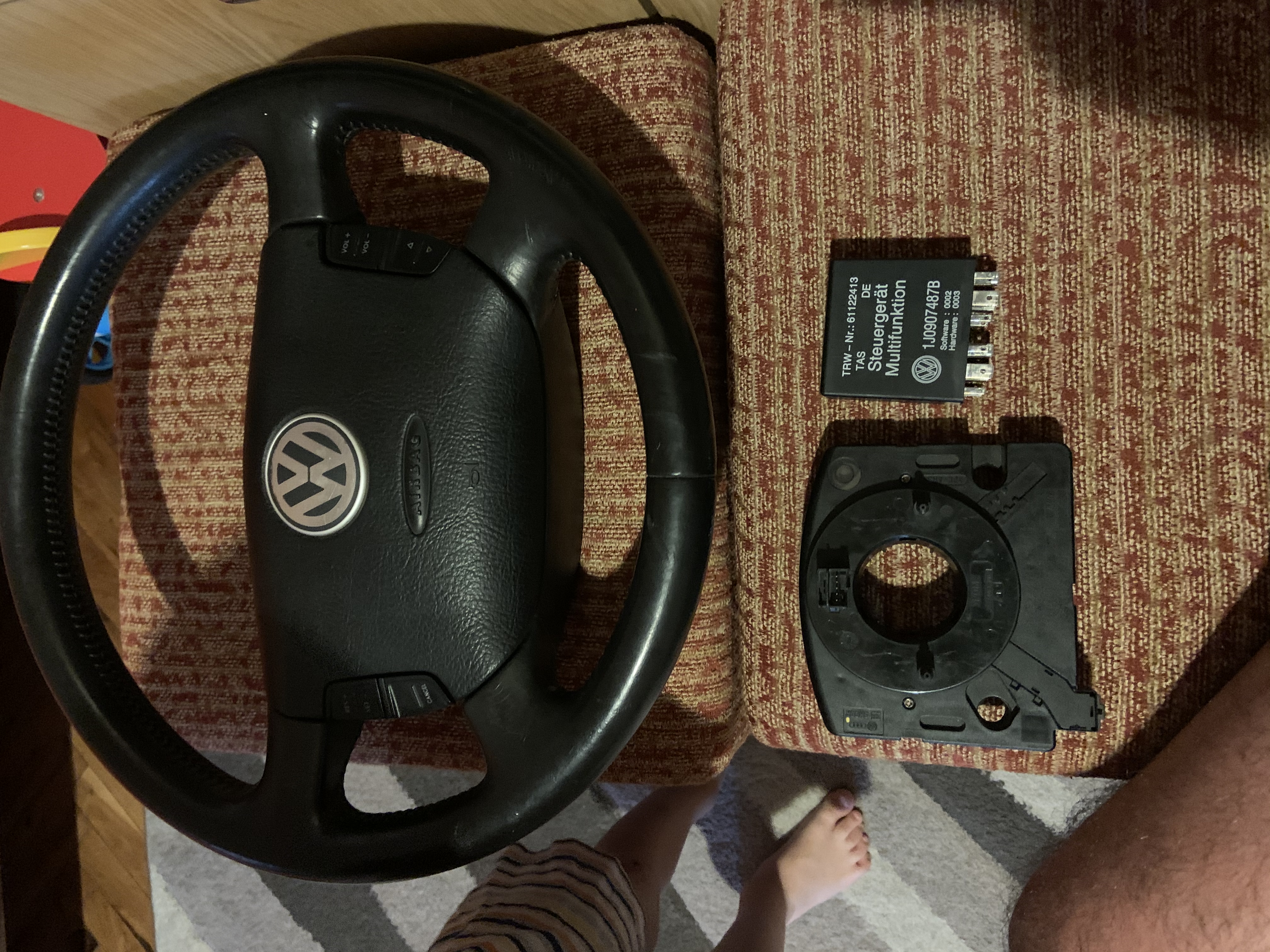 Привет колеги имам следния проблем с окабеляването на мултифункционалиния вола на псат б5,5 ...набавил съм следното мултиволан ,реле , и лентов кабел .....такам смених всичко единствено не зная къде да поставя единия кабел от петпиновата букса така че ако може някой схема нещо да даде ще съм благодарен,разполагам с ето тези части дали ми е необходимо още нещо.релето е с номер 452