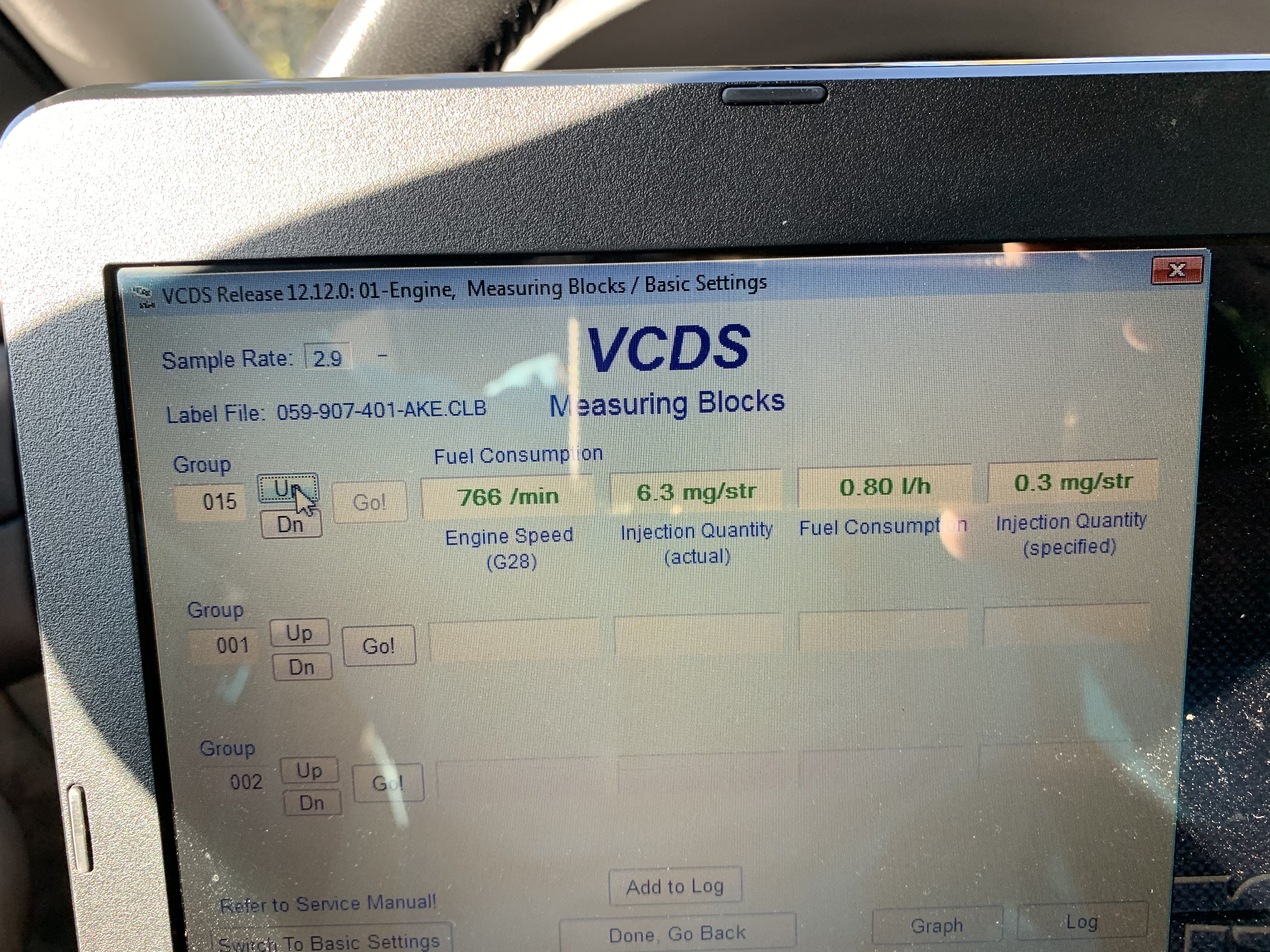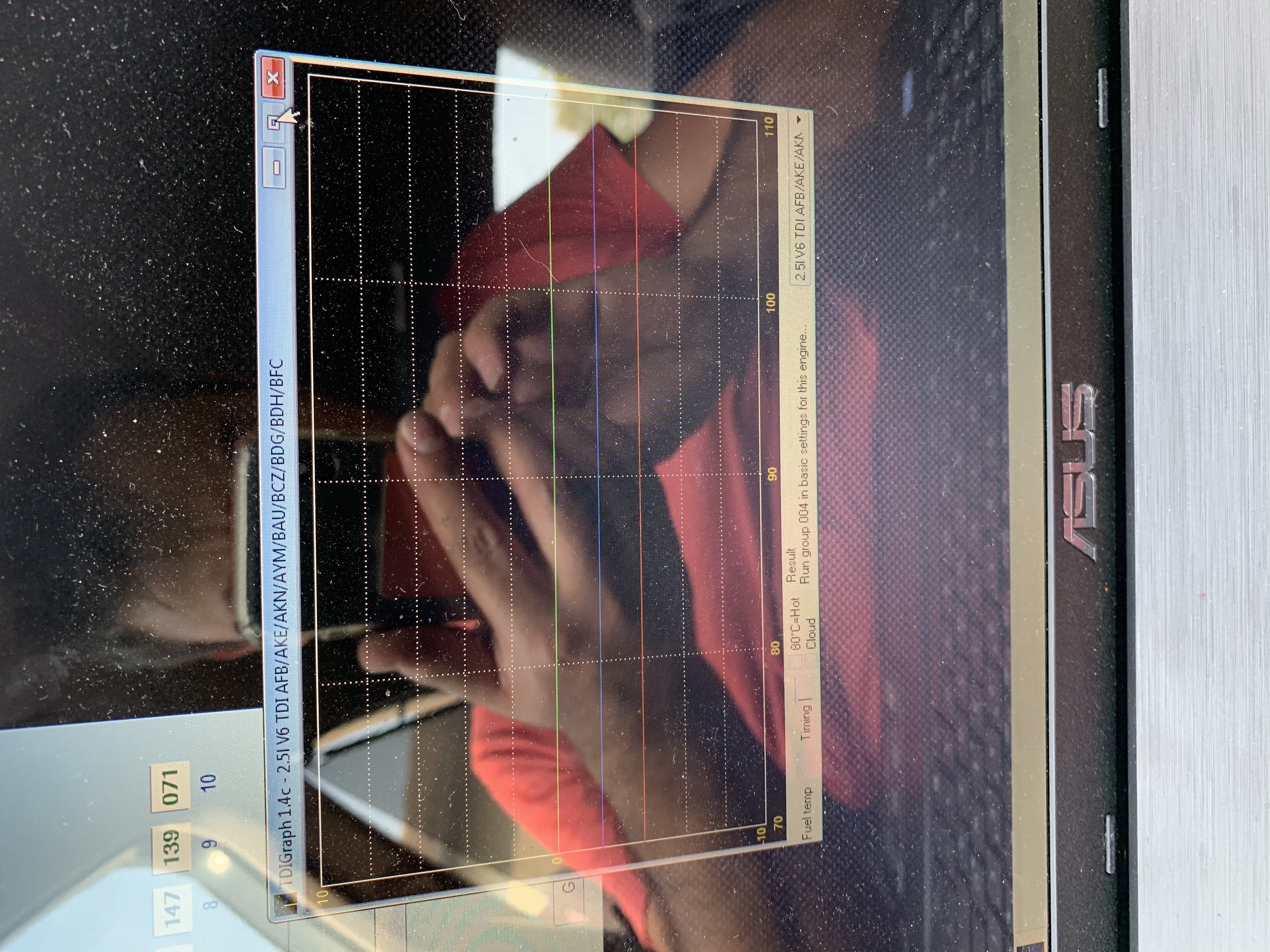 Здравейте колеги , колата и е аудиА6 2.5 ТДИ 180 коня , колата тресе , пуши бяло и няма никаква мощност ( не може даже да се качи на платформа ) . Показателите на дюзите са тези :снимка 1 . А тайминга на помпата ми показва празна графика : снимка 2