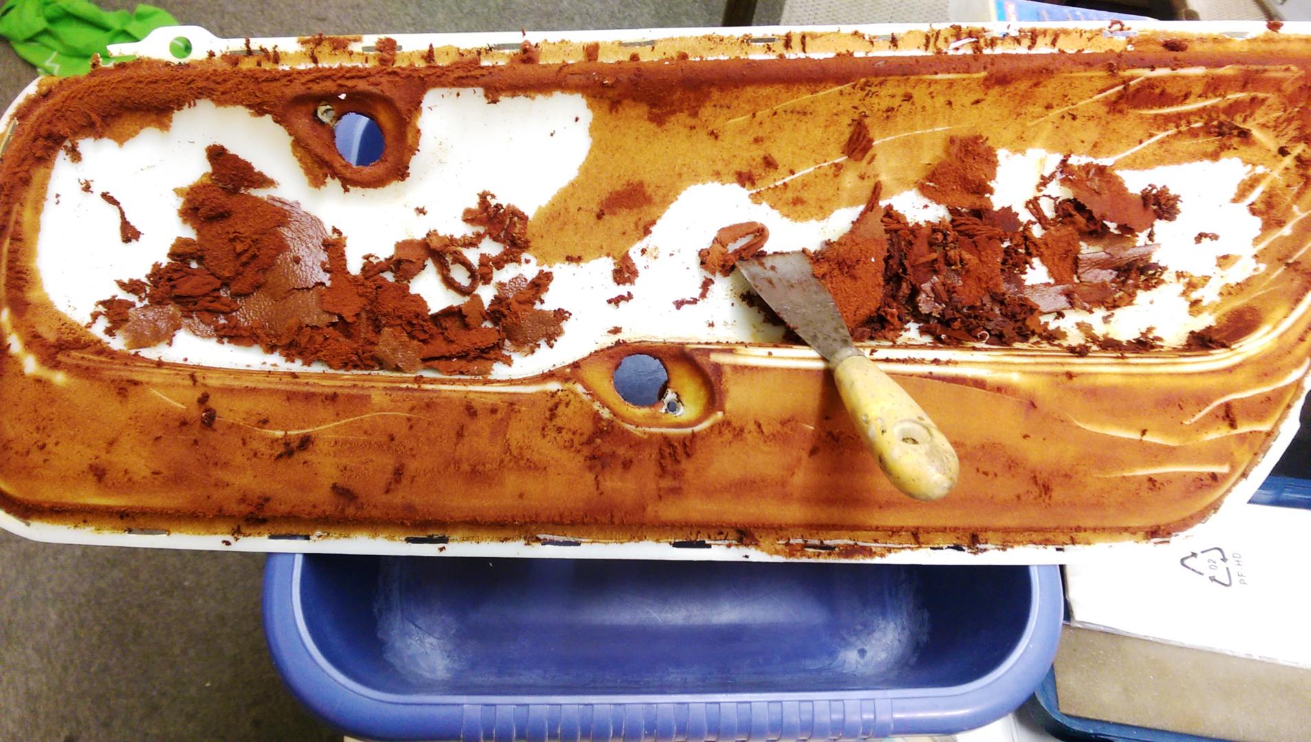 Червената маса е лепкава, грубо я остъргах със шпатола. После пробвах с два разредителя, без успех.