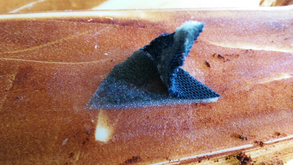 6. Махнали сте кората дървената част и почвате да разлепяте плата. Отдолу остава шибания изгнил донапрен. Никакъв корселин, ама грам. Взимате шкурки, телена четка и жулите докато падне донапрена и оригиналното лепило.