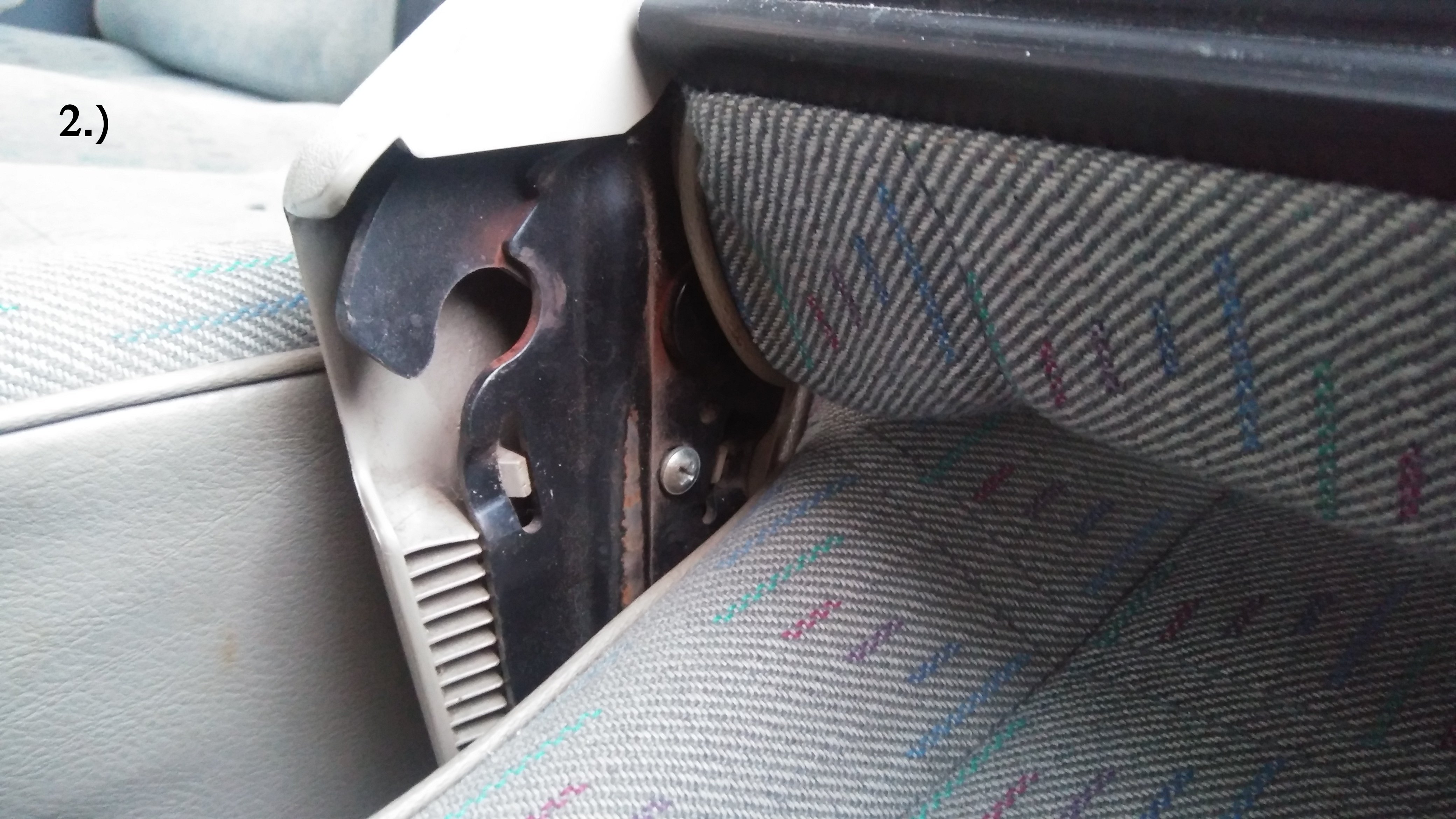 2) Как да сложа женската част на закопчалката на колан (на английски seat belt buckle/ seat belt receiver) на сгъваемата единична седалка от втори ред? Двойните седалки имат отстрани резби в които можеш да завинтиш закопчалките, но на сгъваемата седалка не виждам такава резба (виж снимки). Някаква представа за обходно решение на този проблем?