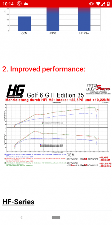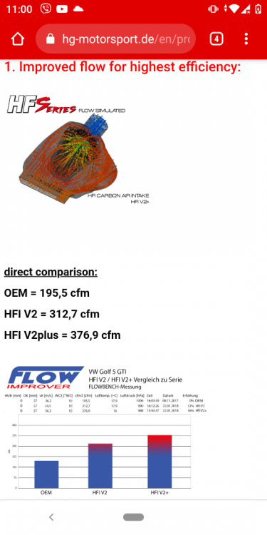 Повишеният вървеж има обяснение на страницата на HG Motorsport, но като го поръчвах махнах с ръка и си казах "поредния рекламен трик". Тестът е правен с Golf 6 GTI Edition 35, на ок.300к.с. С HFI v2+ версията на интейка (каквато е монтирана и в Супърба) Колата е повишила мощността си с този интейк с цели 22 к.с. и 10 н.м.