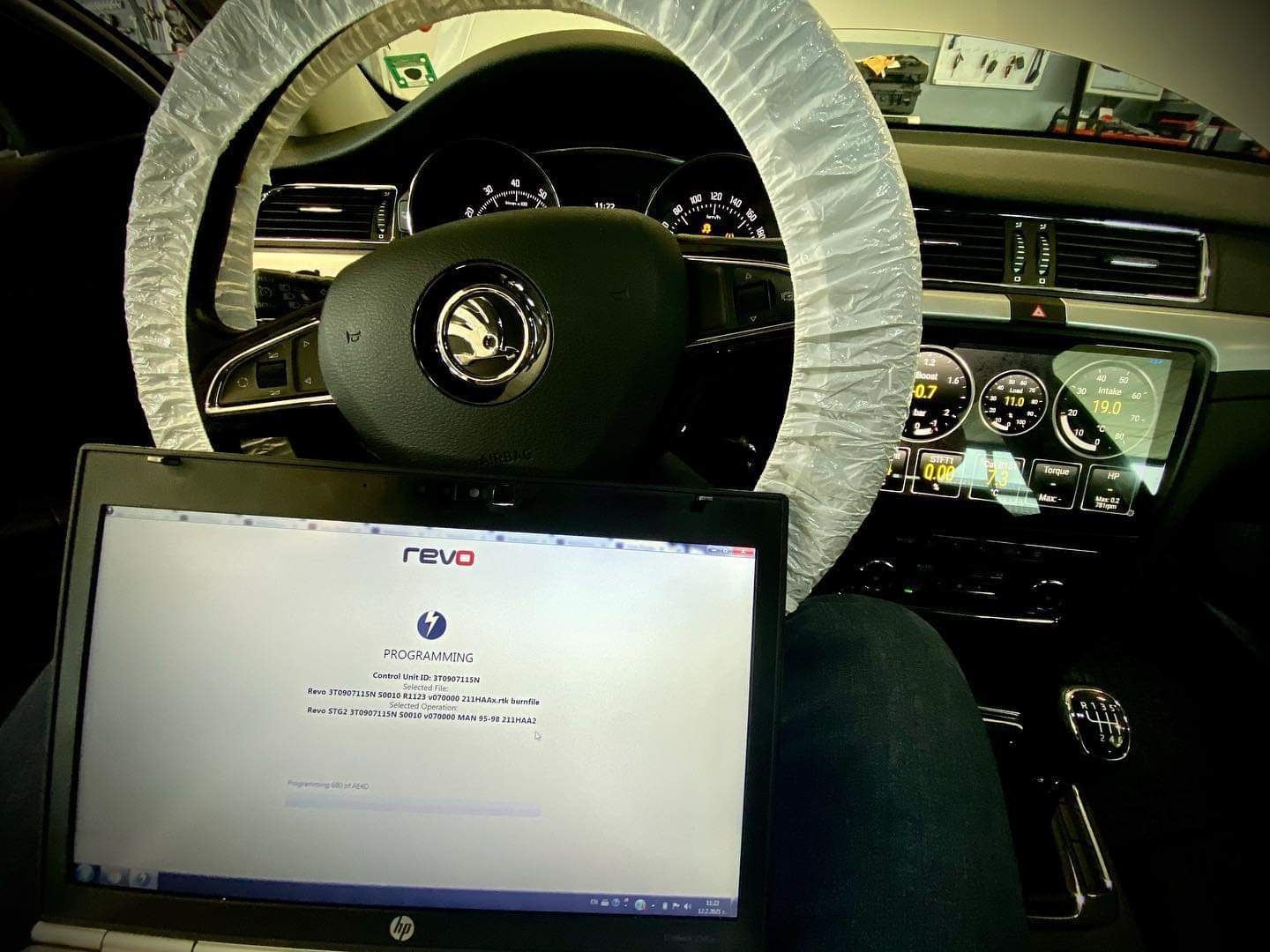 От днес - нова ера! Щастлив собственик съм на Revo Stage 2 !!! Ще разкажа какво провокира промяната на софтуера от APR Stage 1 на REVO Stage 2. Не съм маниак на тема да докарам колкото може повече мощност. Бърза или не, харесвах си колата каквато беше. Смяната на софта бе продиктувана от проблемче. А то започна още след монтажа на големия интеркулер. Във времето него го монтирах след генерацията. Положителният ефект от кулера, вероятно, на всички е познат - по-добро охлаждане на въздуха след нагнетяването/загряването му при преминаване през турбото и преди да отиде към колектора. Разбира се, по-осезаем (спрямо стоковия) е ефектът в летните жеги. Какво още усетих като промяна? Лаг. Лек лаг, дължащ се на увеличения обем на кулера, който малката турбина (k03) трябва да запълни с въздух, за да се случват "нещата". Въпросният лаг отмести с известно количество обороти стоварването на нютоните в ниските, което малко облекчи работата на съединителя. Това го отчетох като плюс, защото мапът на APR още от самото начало ми се струваше доста агресивен в ниските. Принципно е редно да спомена, че ОЕМ кулерът на колата си вършеше прилично работата и реално за целите на Стейдж 1 не беше необходима смяната му! До тук всичко е ОК. Сега следва нежеланият страничен ефект - при ускорение, когато тръгна по-динамично на първа, но след това върна газта и ускорението продължи по-плавно на втора, в един диапазон от 100-200 оборота, преди 3000 оборота, започнах да усещам как колата сякаш се "затапва", сякаш нещо й пречи да ускори освободено, сякаш се получава нещо като back pressure (не е това!), но като стигне 3000 оборота затапването секва и всичко продължава нормално/ отпушено/освободено. Поглеждайки буустметърът на "Torque"-a, виждах увеличаване на налягането докато траеше това "затапено" състояние. Принципно бях спокоен, защото знаех, че това се дължи не на някакъв механичен проблем, а е поради ъпгрейда на кулера, а също така се проявяваше при определен начин на шофиране. Дори не тръгнах да търся точната причина за side effect-a.