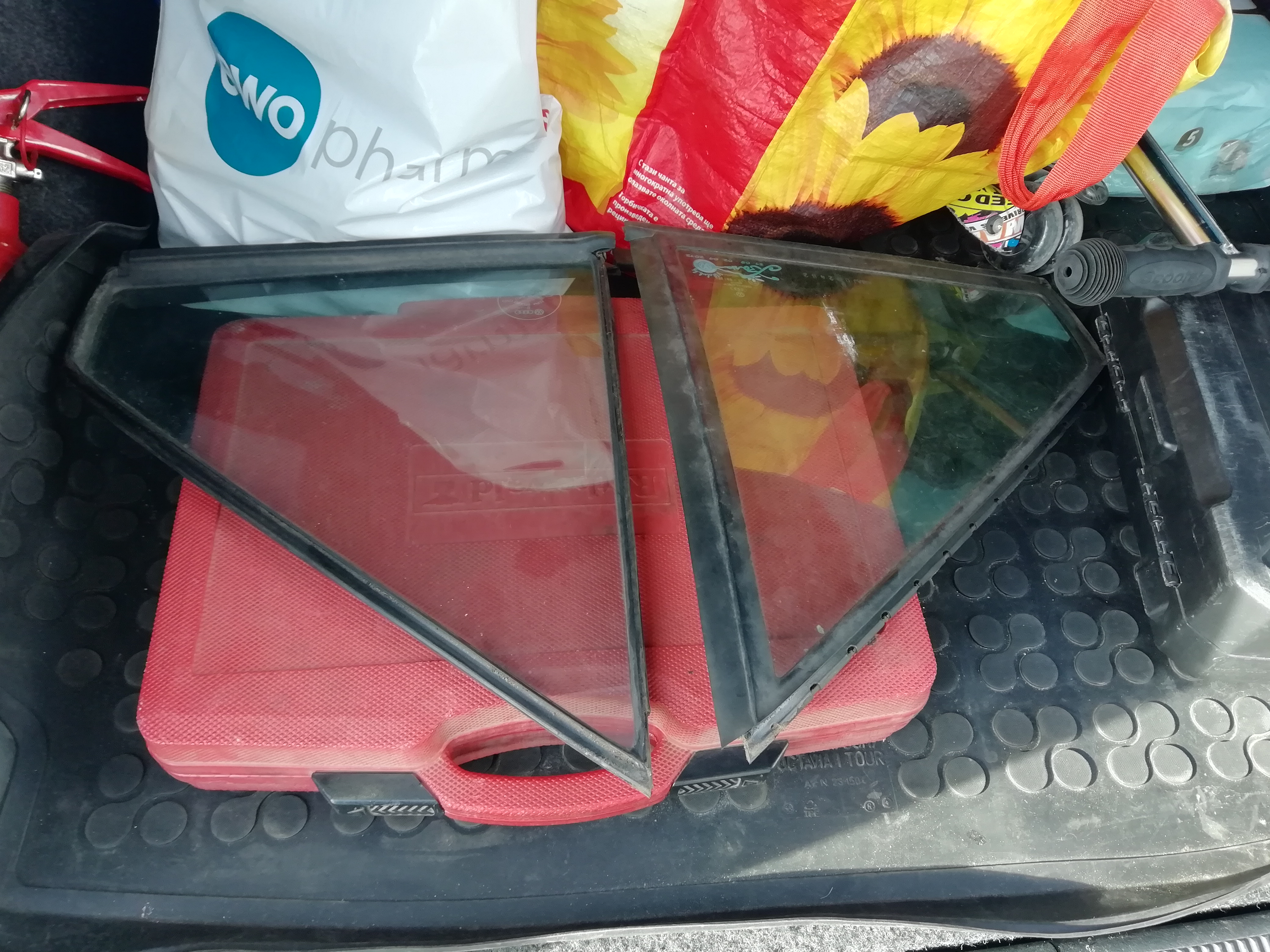 И понеже съм роден с късмет, оказа се че моите триъгълни стъкла са с около 15-20мм по-големи от тригълните стъкла ползвани в дебелите уплътнения на 86с - съответно не можех да ги ползвам. А се налага да ги ползвам защото откъм интериора моите стърчат над метала. Прибягнах до софийския донор, който се оказа със сиви и в лоши състояние кори на вратите. Късмета ми пак "работеше" с пълна сила - колата е с две различни стъкла, едно малко откъм шофьора с дебело уплътнение и едно голямо откъм пасажера с тънко уплътнение макар и за къса вътрешна кора. Въпреки това ги взех, съответно сглобих с тях - ето ги едно до друго да се видят разликите: