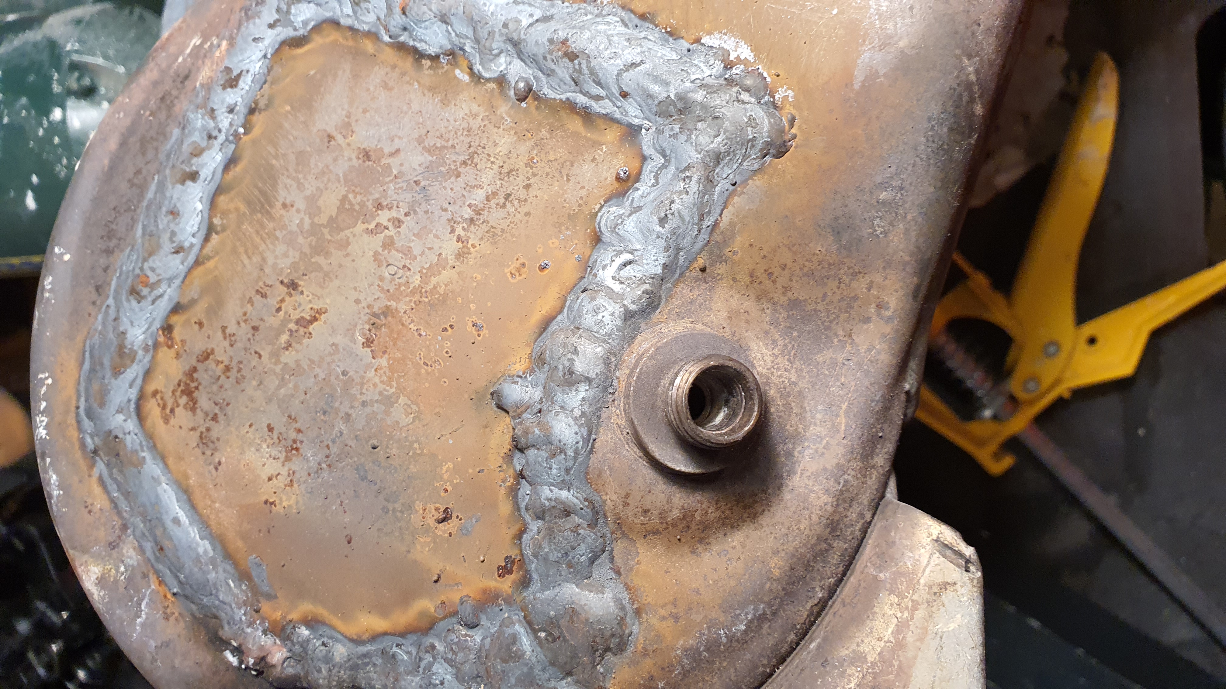 Гледате разрязан брутално дпф за почистване. Заварен по също толкова некадърен начин, че да изспуска заварката.
