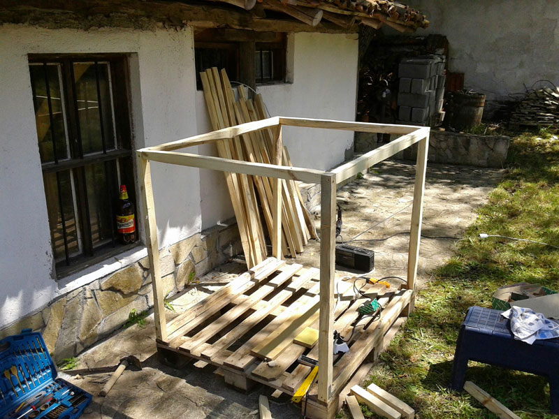 ами, важното е да се получи що-годе устойчива рамка, но и самите странични дъски също заздравяват конструкцията. основата при мен е от цял палет, постлан с парче винил и отгоре ламинат. под покривните дъски също има винил, за хидроизолация. там, където е невъзможно да се завинти дърво в дърво, съм използвал метални планки.