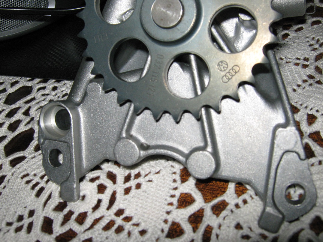 . Цената беше колкото цял оборудван двигател ABU втора ръка тогава и бая време пестих за тая помпа, но просто колата има сантиментална стойност за мен и за това се и прежалих. Иначе както колегата caro е споменал доста време се чудих дали направо да не върна двигателя за рециклиране и да не сложа ABF или AUM, но просто единственото нещо което ме спираше беше доста високата цена на тези двигатели тогава. Да те предупредя, че VW правят инженерни изменения при новите помпи за разлика от старите такива главно в самите лопатки и най вече в пластмасовия водач на веригата. При новия модел липсва водача да не се чудиш, ако намериш атлтернативна помпа и успокоителят на веригата липсва. Ето за какво говоря:На първата снимка старата помпа от колата, а на втората снимката вече новия дизайн на VW, без отвори за болтовете за успокоителя на веригата, които е на третата снимка.