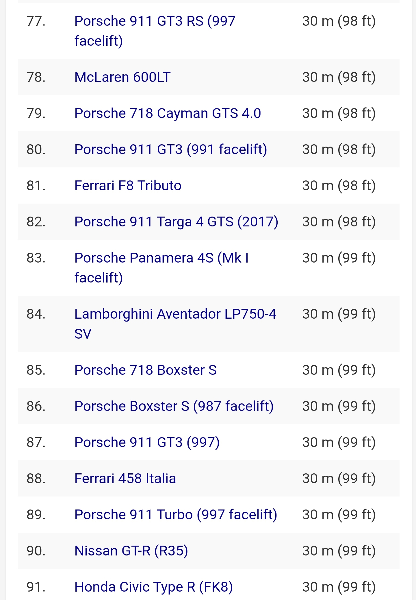 Зависи от гумата и настилката. А не от марка и модел кола, дори не и от тегло. И варира в относително тесни граници при тестовете за максимални спирачни възможности. От което следва, че разлики в чистия спирачен път при скорости до около 100км/ч(каквито са повечето тестове), не може да варира в прекалено големи граници с що-годе адекватни гуми.