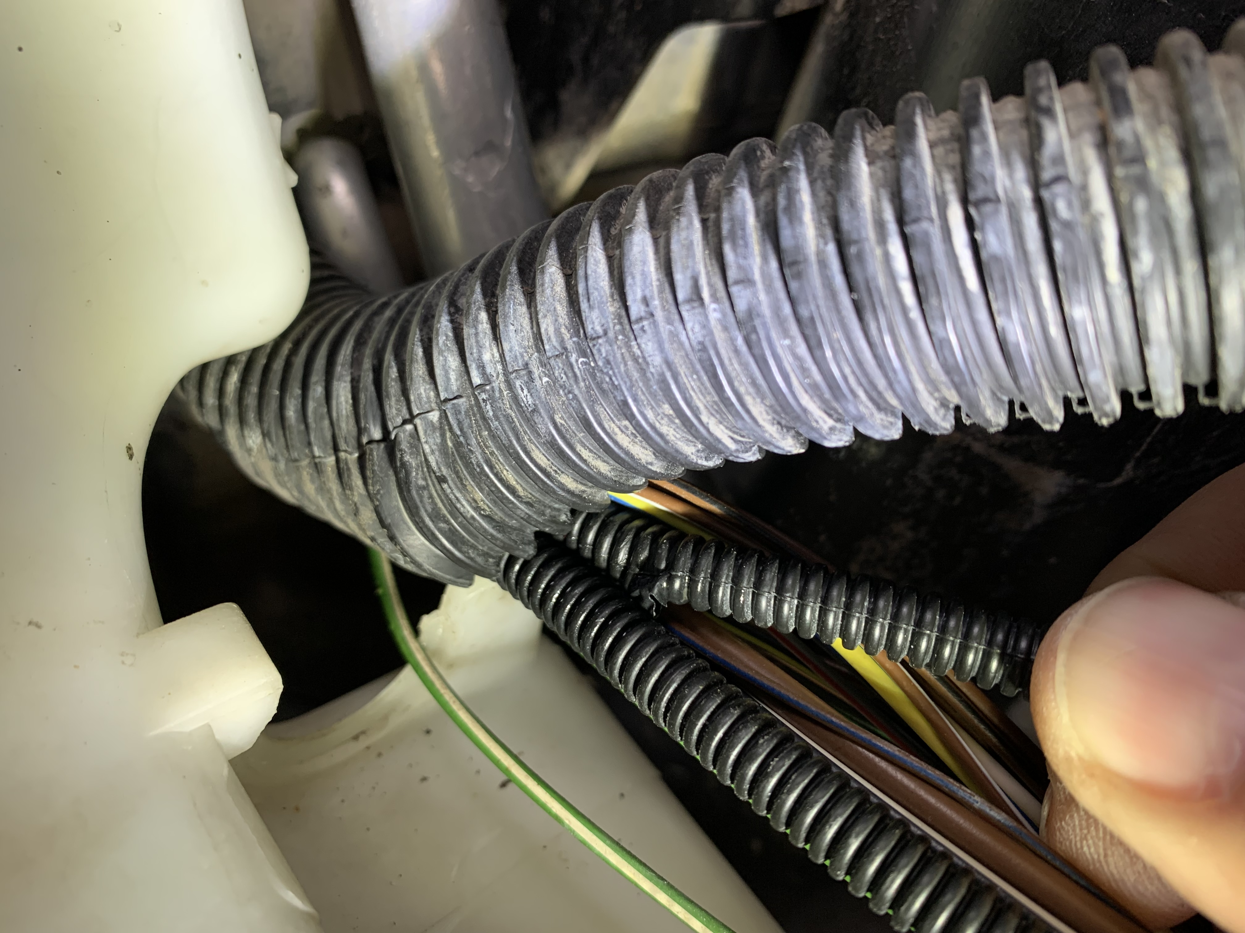 Според мен е дефект в самия маркуч, защото няма как да се притисне там (в гофре, заедно с другия маркуч и сноп кабели), а и се вижда как е раздуло отвътре навън.